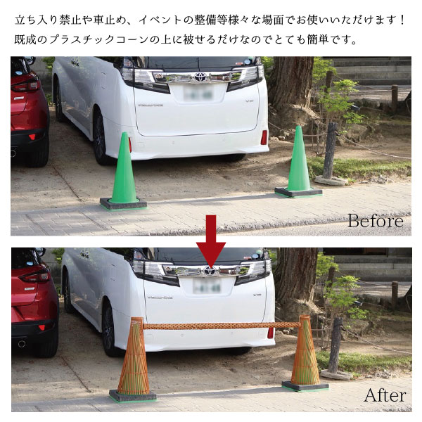 メーカー直送 ご入金確認後約7〜8営業日後出荷(数量/混雑状況次第による)(目安)※こちらの商品は予期せぬ欠品・廃番の可能性がございます。プラスチックコーンに和の趣を。・コーンは付属しません。 ・自然素材の商品のため、経年で割れや反り・ねじれが発生する場合もあります。また、美観は探求した商品ではありませんので、多少の傷やムラが稀にある場合もあります。 【特長】既成のプラスチックコーンのコーンの上に被せるだけで和風景観に馴染み、プラスチックコーンを目立ちにくくする竹製の商品です。ひとつひとつ手作業で編み込んでおりますので落ち着きと温もりを感じることが出来ます。【サイズ】約?310×約H700【材質】主要部:天然竹 紐材:たこ紐(綿100%)【関連ワード】BC-11、車止め、仕切り、進入禁止、神社、駐車禁止、61007541木製結界 屋内用 W900 BCL-09 多目的バリケード 【キャンセル不可】 催事場等の屋内イベントのバリケードなどに木製結界 屋内用 W1200 BCL-12 多目的バリケード 【キャンセル不可】 催事場等の屋内イベントのバリケードなどに結界 屋外用 SPF材 W1200 BCS-12 多目的バリケード 【キャンセル不可】 催事場等の屋内イベントのバリケードなどに結界 屋外用 SPF材 W1500 BCS-15 多目的バリケード 【キャンセル不可】 催事場等の屋内イベントのバリケードなどに結界 屋外用 ヒノキ材 W1200 BCC-12 多目的バリケード 【キャンセル不可】 催事場等の屋内イベントのバリケードなどに結界 屋外用 ヒノキ材 W1500 BCC-15 多目的バリケード 【キャンセル不可】 催事場等の屋内イベントのバリケードなどに