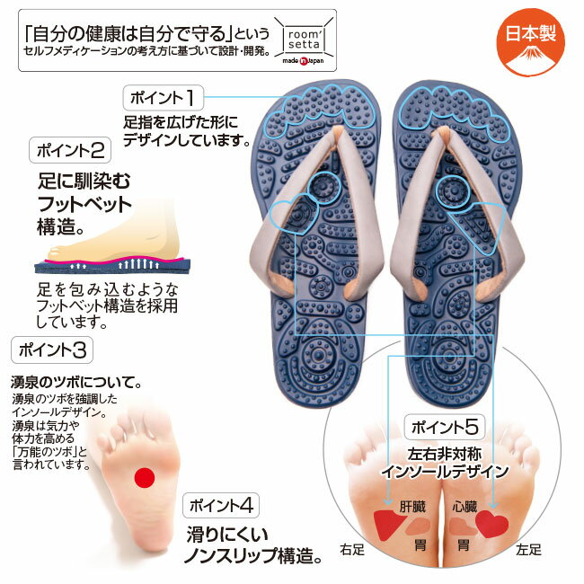 商品説明足解放!お部屋で履くだけで足ツボマッサージ!履くだけで、足の裏が赤くなるほどモミモミ。食事、 睡眠、 体力...。「歳とともに健康の悩みが増えた」という方には室内で履く「ルーム雪駄」がおすすめ。本品は足裏の部分に大小無数の突起を配置、歩行時の重心移動で突起が足裏をグイッと押して刺激、しばらく履くと足の裏が赤くなるほど揉まれます。人間の内臓の配置が左右非対称なことに倣い、本品の突起も左右非対称に配置されています。また足指で花緒を挟むことで歩行時にグッと足指に力が入り自然に「グー・パー運動」ができ足裏や脛の筋肉も鍛えられます。【 商品詳細 】●サイズ/S(22.5〜23cm)、M(24.5〜25cm)、L(26.5〜27cm)※ユニセックス対応●重さ(約)/片足140g( Sサイズ)●材質/花緒:合成皮革、先緒・花緒裏:PUスエード、インソール:EVA(抗菌剤配合)、底:フェルト(滑り止め付き)●生産国/日本