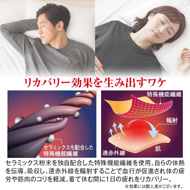 商品説明着るだけで血行促進、疲労を回復させるリカバリーウエア◆着るだけで疲労を回復!リカバリーホームウェアです。・セラミックス粉末を独自配合した特殊機能繊維の遠赤外線効果で、筋肉のハリ・コリを緩和して疲れを軽減。血行促進。◆季節を問わず一年を通して着用いただけます。◆就寝時やリラックスタイムにおススメ。・スッキリ気持ち良く目覚めていただけます。◆体の締め付けがないゆるフィットなデザインでストレッチ性が高く着心地も抜群。◆ウエストには便利な調整紐付き。◆パンツには左右にポケットもついていて便利です。【 商品詳細 】●素材/ポリエステル80%・綿20%●仕様/パンツ:ウエスト総ゴム(取替不可)、調整紐付き、両脇ポケット●一般医療機器 家庭用遠赤外線血行促進用衣71105001●医療機器製造販売届出番号:13B1X10360000037●広告文責/日本直販株式会社●メーカー・販売業者/株式会社セルヴァン●区分/医療機器●生産国/中国※湿疹・かぶれ、傷口など皮膚に異常がある時は着用しないでください。※着用時、異常(かゆみ、かぶれなど)を感じたら、ご使用を中止してください。※効果には個人差があるため、長期的なご着用をおすすめいたします。※睡眠時の着用は、発汗作用が高まりますので、充分な水分補給を行ってください。※本品は素肌の上から直接着用してください。※本品は上下セットでの着用をおすすめします。※繰り返し使用可能ですが、素材の特性上、湿気や日光(紫外線)の影響を受けたり、長期の使用による経年劣化で伸びが生じたりする場合があるため、耐用期間を2年とさせていただいております。別売品・関連商品はこちらから<着る疲労回復> リカバリーホームウェア 上下セットはこちら><着る疲労回復> リカバリーホームウェア 半袖+7分丈パンツはこちら>