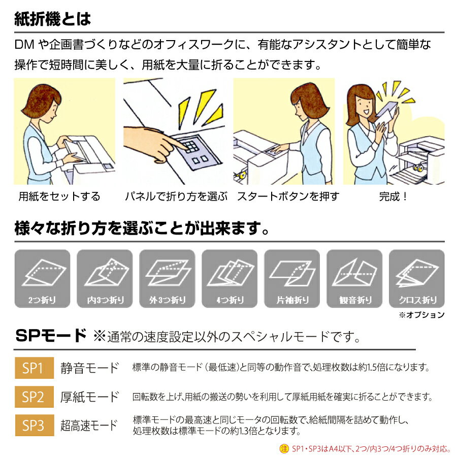 ※返品についてメーカー希望小売価格はメーカーカタログに基づいて掲載しています ライオン事務機 紙折り機 LF-S621 静音モード搭載、スタンダードタイプ。 ※こちらの機種はクロス折りの際にクロス折りパーツが別途必要です。 クロス折りパーツ付きモデルはこちら 主な仕様 品番 LF-S621 対応用紙サイズ A3〜B7(B6は観音折り不可、A6・B7は2つ折りのみ可) 紙質 40kg〜110kg(46.5g/m2〜127.9g/m2)、2つ折りは135kg(157g/m2)、クロス折りは90kg(104.7g/m2)まで 上質紙、上質孔版紙、中質紙、更紙 用紙積載量(上質55kg) 500 枚 処理速度/時(分) 2,400〜14,400 枚/時 (40〜240 枚/分) ※A4 サイズ2つ折り時 カウンター 4桁 加算・減算(オートリピート機能付き) 折り形種類 2つ折り、3つ折り、外3つ折り、4つ折り、片袖折り、観音折り、2回通しによるクロス折り7種類 クロス折り 〇(オプション)※クロス折りパーツ別売 折り位置調整 手動(ゲージ式) 斜行調整機能 〇 紙詰まり検知 自動停止 トラブル表示 ジャムマップ表示(トラブル位置を図解で表示) 折ローラー脱着機能 なし 排紙テーブル昇降方式 手動 排紙ローラー移動方式 なし 排紙方法 自然落下方式 使用時寸法(収納時) W800×D545×H494mm (W652×D545×H494mm) 質量 25.5kg 消費電力 50W JANコード 4903331846520 【検索用ワード】 LF-S620後継 LION 紙折り機 業務用 DM 卓上 a3 a4 a5 b4 2つ折り 片袖折り 二つ折り 三つ折り 折り機 外三つ折り 四つ折り コンパクト 紙折機 4つ折り 事務用品 自動紙折り機 小型 事務 安い 厚紙 静音
