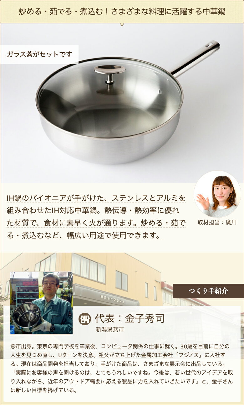 商品説明 内容 ガラス蓋付き アルミクラッド三層中華鍋 27cm 配送方法 ヤマト運輸(通常便) 材質 本体:18-0ステンレス・アルミ・18-8ステンレス(アルミクラッド三層鋼) 取っ手:18-8ステンレス ガラス蓋:全面物理強化ガラス・18-8ステンレス ガラス蓋持ち手:18-8ステンレス 対応熱源 IHクッキングヒーター(100V・200V) ガス ハロゲンヒーター ラジエントヒーター シーズヒーター サイズ 【中華鍋】 全長(持ち手含む):435mm 全高(持ち手除く):85mm 内径:270mm 接地底径:190mm 底の厚さ:1.3mm 【ガラス蓋】 全高:65mm 直径:280mm 重量 中華鍋:1kg ガラス蓋:700g 使用上の注意 ※食洗機は使用できません。 ※使用後は、食器用洗剤を付けて洗い、よく乾かしてから保管してください。 返品交換 受注生産品や生鮮品・食品などの商品の性質上、返品・交換はお受けできません。 ただし、配送中の事故により、お届けした商品に傷みや破損がある場合や、到着した商品がお申込み頂いた商品と異なっていた場合には、返品・交換を承ります。 ご連絡は商品到着日・並びに翌日以内にお願い致します。 生産者 フジノス のし・包装サービス 場所 外のし(二重包装) 形状 普通のし 表書き 寿(紅白結びきり) / 寿(紅白蝶結び) / 誕生日御祝(紅白蝶結び) / 御祝(紅白結びきり) / 御祝(紅白蝶結び) / 御中元 / 御歳暮 / 御年賀 / 粗品 / 出産内祝(紅白蝶結び) / 結婚内祝(紅白結びきり) / 入学内祝(紅白蝶結び) / 内祝(紅白結びきり) / 内祝(紅白蝶結び) / 感謝(紅白蝶結び) / 御礼(慶事) / 御礼(弔事) / 無地のし(慶事) / 無地のし(弔事) / 暑中御見舞 / 残暑御見舞 / 寒中御見舞 / 志(仏事) / 御供(弔事) / 御見舞 / 御挨拶 / 快気祝 / 御新築祝 / お父さんいつもありがとう / お母さんいつもありがとう / 賞品(紅白蝶結び) / 記念品(紅白蝶結び) 名入れ 対応可能 フジノスの商品一覧へ 通販/産地直送/新潟名物/産直/新潟県産/新潟産/母の日/父の日/敬老の日/こどもの日/子供の日/お中元/御中元/お歳暮/御歳暮/お年賀/御年賀/ご挨拶/香典返し/バレンタインデー/ホワイトデー/ハロウィン/贈り物/贈答用/プレゼント/ギフト/プチギフト/のし/熨斗/のし無料/熨斗無料/送料無料/おみやげ/お土産/包装/ラッピング/特産品/名物/端午の節句/暑中見舞い/暑中御見舞/残暑見舞い/残暑御見舞/寒中見舞い/寒中御見舞/内祝い/御祝い/逸品/誕生日祝い/誕生日御祝/還暦祝い/米寿/お取り寄せグルメ/入学祝い/入学御祝/合格祝い/合格御祝/引っ越し祝い/引っ越し御祝/快気祝い/快気内祝/ご当地グルメ/B級グルメ/老舗の味/ご自宅用/クリスマス/イベント/引出物/上司/同僚/七五三/ひな祭り/成人の日/成人式/お返し/寿/御見舞/越後/出産祝い/出産内祝/贈答品フジノスの商品一覧へ