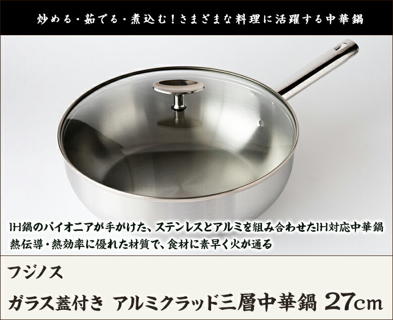 ガラス蓋付き アルミクラッド三層中華鍋 27cm フジノス【代金引換決済不可】【IH対応/ステンレス/アルミ/3層構造/軽量/キッチン/調理/煮込み/蒸し焼き】【お土産/手土産/ギフトに!贈り物】【送料無料】