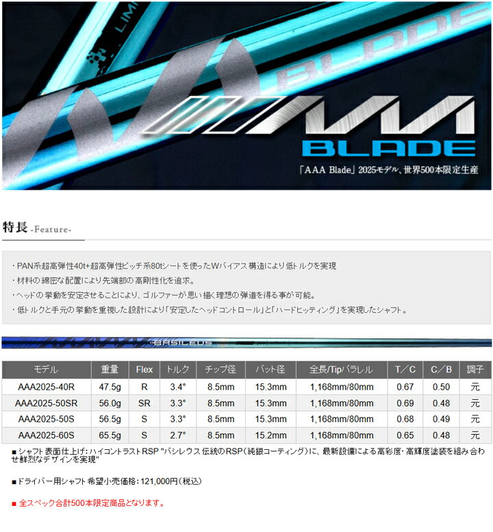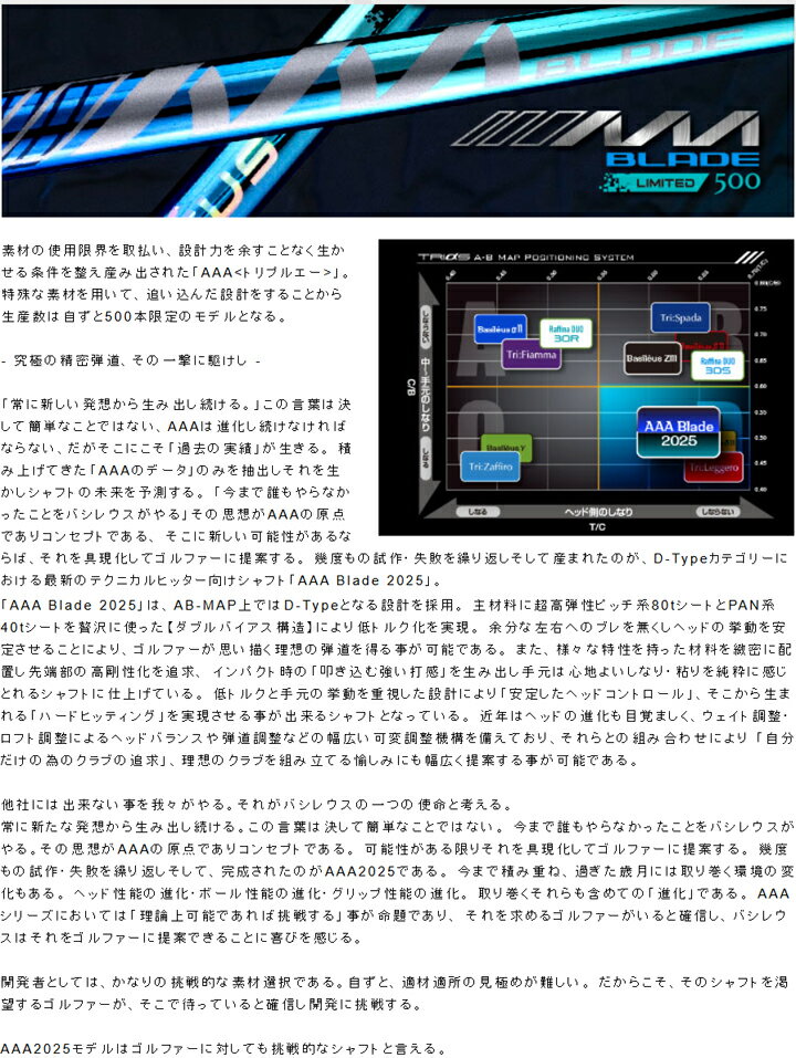 タイトリスト ドライバー用 CMX互換スリーブ付カスタムシャフト 【2025年モデル】Basileus/バシレウス 500本限定生産 2025AAA BLADE 2025トリプルエー ブレード Dタイプ トリプルA GT/TSR/TSi/TS/917/915/913/910ドライバー用 【送料無料】