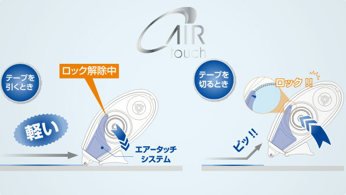 ◇製品仕様◇ ●用途:ノートへのプリント貼り、封筒の接着、デコ等 ●本体サイズ:幅32 × 厚さ20 × 全長73mm ●重量:17g ●仕様:テープ幅6mm × 長さ10m / 使いきりタイプ 接着タイプ[パワーネットテープ] エアータッチシステム搭載 開閉式ヘッドカバー付 / ローラーヘッド <ケース>PS樹脂 ◇配送情報◇ ■クリックポストをご利用の場合、合計3,980円(税込)より送料無料になります。 合計3,980円(税込)以下の場合、ご購入金額により送料が変わります。 購入金額合計:1〜999円(税込)→送料350円(税込) 1,000〜1,999円(税込)→送料290円(税込) 2,000〜3,979円(税込)→送料200円(税込) ■ご不明な点がある場合、お気軽にお問い合わせください。 ■在庫数以上のご注文も承ります。 ■取り寄せ時の目安は約7〜10日(土日祝祭日除く)です。最後まで、驚くほど軽く引ける 「エアータッチシステム」を搭載し、最後まで驚くほど「軽い」引き心地を実現したテープのり「ピットエアー」のコンパクトサイズ。使い心地を徹底追及しました エアータッチシステム搭載 紙面に押し付けるとエアータッチシステムが作動(ロック解除)。紙面から離すとシステムがテープの供給をロックし、のりが切れます。 パワーネットテープ 網目形状「パワーネットテープ」を採用。良好なのり切れと強い粘着力の両立を実現しました。 静音設計 使用中に気になるテープのりの走行音を低減しました。静かな場所でも音を気にせずのり付け作業ができます。 フルカウルヘッドカバー 携帯時はゴミの侵入を防ぎ、使用時は簡単操作で開閉可能。テープ走行時にはカバーが邪魔になりにくいこだわりの設計。 エアーフィットヘッド 本体が傾いても瞬時にヘッドの角度を補正して、ムラのない均一なのり付けを実現します。 使いきりコンパクト ペンケースにも入る持ち運びにも便利なミニサイズ。