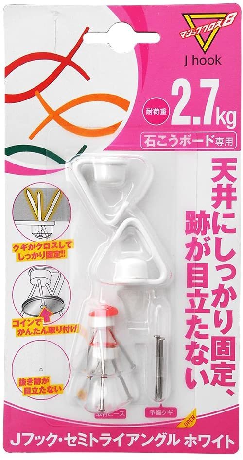 商品情報商品名マジッククロス8 Jフック・セミトライアングル ホワイト(1セット2個入り)耐荷重(最大垂直荷重)2.7kg/個用途【天井・壁両用】・クロス張りの石こうボード壁(9.5mm以上)※使用不可※・コンクリート、レンガ、ブロック、タイルなどの固い壁・土壁、しっくいなどのもろい壁、京壁・吸音ボード(石こう、ロックウール)使用例観葉植物、ペンダント照明、模型飛行機などサイズW17×H20×D10材質フック:鉄(ポリエステル樹脂塗装)キャップ:ポリエチレン取付ピース:ABS樹脂釘:ステンレス注意事項※モニターの発色具合により色が異なる場合があります。※傾斜面や不安定な場所では使用しないでください。※フックの先端に荷重が加わる掛け方はしないでください。※表示荷重以上のものは掛けないでください。※貴重品や壊れやすいものは掛けないでください。※このフックを改造・変形して使用しないでください。※釘の先が尖っているので、指などにささらないように注意してください。※フックを取り外す際は、釘をすべて抜いてください。釘がささったままフックごと引っ張ると、壁を傷めることがあります。※フックを取り外した時、壁面に直径約1.0の釘跡が3ヶ所残ります。※子供の手のとどかない所に保管してください。(誤飲防止の為)【メーカー直販】天井用 石膏ボード フック マジッククロス8 Jフック・セミトライアングル白 耐荷重2.7kg 壁穴小さい 壁掛け インテリア 賃貸 壁紙【日軽産業】 天井用フック 釘 画鋲 ビス 家庭用 リビング 重たい 模様替え 簡単 部屋 丈夫 ピン 天蓋カーテン 蚊帳 モービル フェアリーライト 3本の釘でしっかり支える!目立たず頑丈なマジッククロス8シリーズ 30年以上販売しているフックシリーズの商品となります。天井用のフックで、耐荷重は2.7kg!天蓋カーテン・プランター・モービルなどを吊り下げるのにオススメです! 抜き跡が目立ちにくい石膏ボード専用のフック! 工具いらず!コインでもお手軽に設置可能! 3本の釘でしっかり支える天井専用のフック! 天蓋カーテンやプランターを吊り下げたい方に 天井用フックをお探しの方に しっかりとした品質をお求めの方に 日軽産業株式会社マジッククロス8シリーズはフック業界において有数の歴史を持つ商品です。販売開始から30年経ちましたが、3本のクロスピンを使った弊社オリジナルの画期的な構造は今も変わっていません。長年愛用され続けてきた品質の良さと使いやすさ、優れた耐久性と耐荷重性を、 是非お客様に体験していただければと存じます。 1