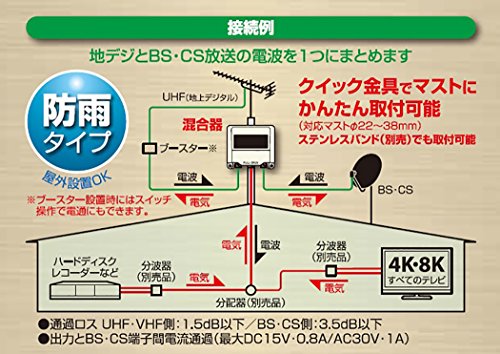屋外用・ホワイト MEUV・・Style:屋外用PatternName:単品・【特徴】電力が供給されると電通ランプ(赤色)が点灯するため、通電状況を確認できます。・【特徴】高いシールド性能により、Wi-Fiや携帯電話など、他の電波の影響を受けにくく与えにくい製品です。・【特徴】外部は樹脂/内部は板金ケースのシールド構造により電波の漏洩や飛込み防止に対応しています・【特徴】4K・8K放送(3.2GHz)対応。従来のテレビにもご使用いただけます。・【仕様】入出力端子:F型説明 【用途】2つの電波(BS/CSと地上デジタル)を1つに混合します。入力/出力端子を逆に接続することで、混合された電波を分ける分波器としてもご使用いだたけます。