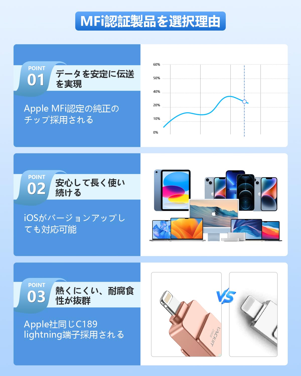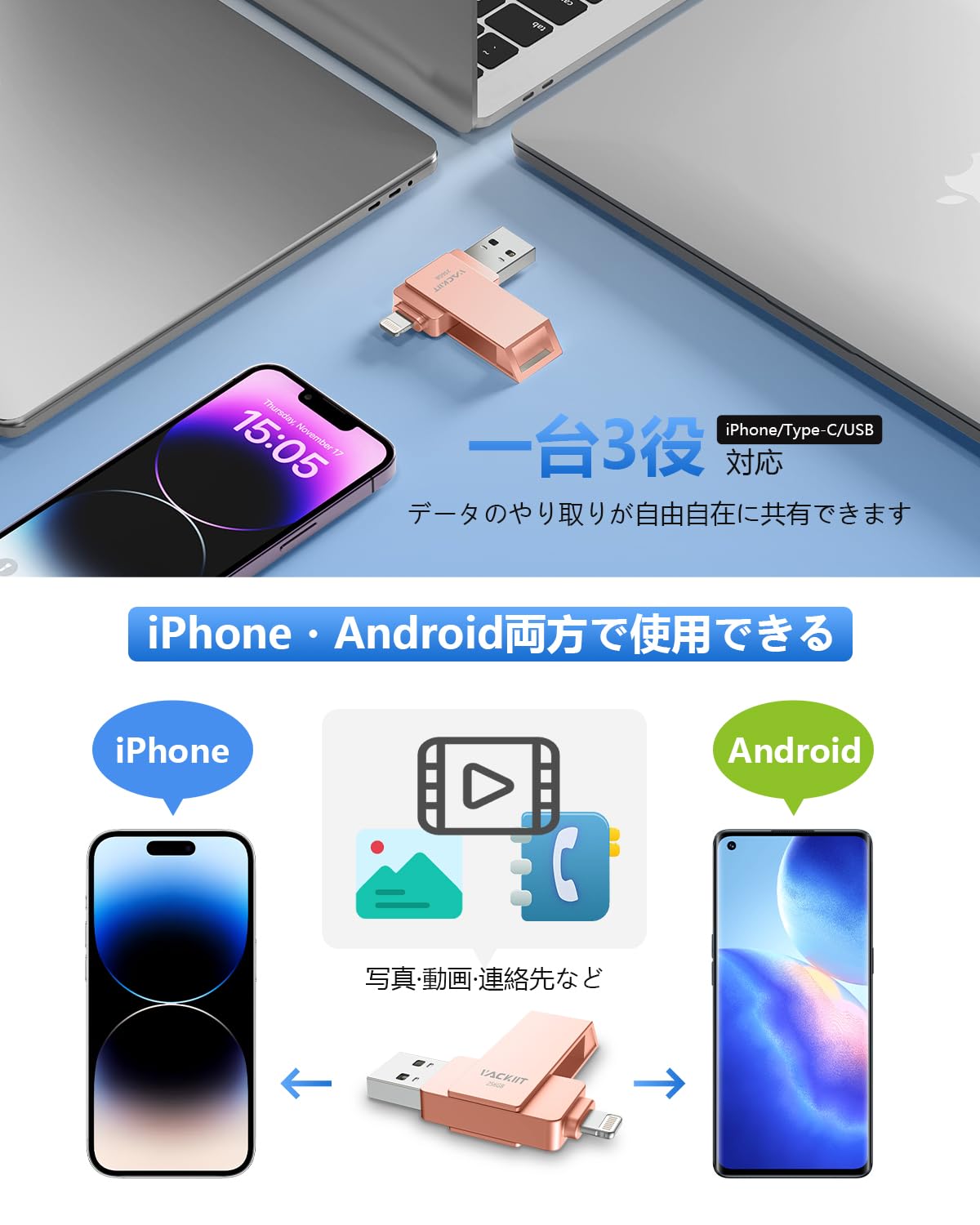 design・ピンク 56GB ・・Size:56GBColor:ピンク・?Apple MFi認証取得・高い互換性iPhone 用Bメモリでは、アップルが設けた認証プログラム Apple MFi が認定されております。これアイフォン バックアップはアップルより提供されたライトニングコネクタを使って、アップルのサポートを受けて作成された周辺機器です。なので、すべてのiPhoneおよびiPadシリーズと互換性があります。iPhone 14 /14 Pro/13 Pro Max/13 mini/ 1 /1 Pro/1 Pro Max/1 mini/ 11 /11 Pro/11 Pro Max / /X /XS/XS Max /XR/8 Plus/8 / 7 Plus/7 /6s Plus/6s/6 6 Plus /iPad Air iPad(第9/8/7/6/5世代)iPad mini(第6/5/4/3世代)10.5インチiPad Pro 9.7インチiPad Pro / iPod touch 6/7/ MacBook Air/Macbook Pro/ iMa?正規チップ搭載・専用APPで操作簡単Bメモリ・フラッシュドライブにはの最新チップを採用しているので、発熱やデータファイルの喪失が起きにくいです。Bフラッシュメモリと接続すると、データ保存・データ転送・音楽再生・写真バックアップ・動画/画像/資料などの編集はできます。専用アプリ付きBメモリーは、容量状況をひと目で確認でき、より短い時間でデータをバックアップでき、一括バックアップでも選択コピーでも、簡単にデータを移行できます。