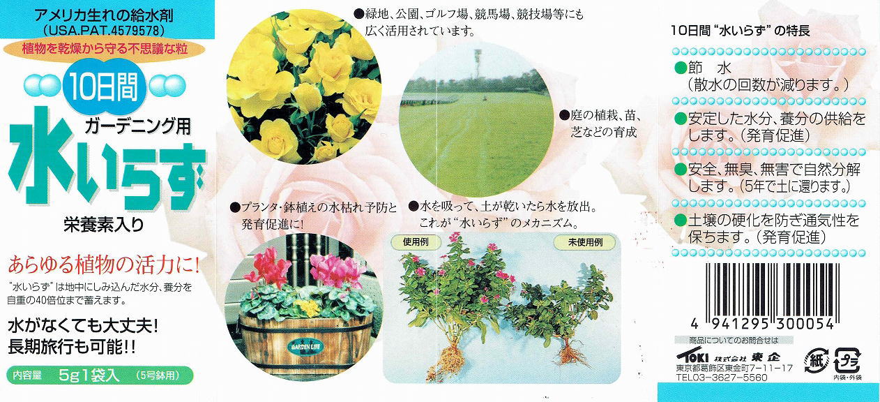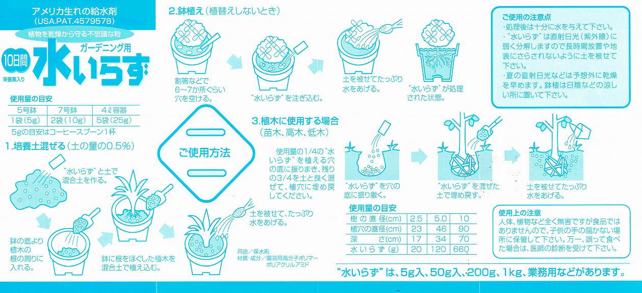 植物を乾燥から守る不思議な粒 ガーデニング用 10日間水いらず ○「10日間水いらず」は、園芸用に開発されたポリマーで、使用量は5g(1袋)で5寸鉢分(直径約15cm)です。 芝生やお庭の花壇に鉢植え、水を吸収しやすく乾燥しやすいハンギングバスケットにも最適! 土に混ぜ一度水を与えるだけで、ポリマーが土の中の水分率による浸透圧の作用により収縮を繰り返し、 水やりが軽減するスグレものです。 また、収縮を繰り返すことにより土に空洞ができ、根まで酸素が届きやすくその発育を促進させます。 しかも無機質なので、使用後約5年すると微生物分解を始める自然に優しい商品です。 ○毎日の十分な水やりにより土の中の水分率が高い場合、ポリマーは水を最大40倍まで吸収しますが、 周りの圧力が強いため水を吐き出しません。しかし、水分率が低下し始めると周りの圧力が弱くなるため、 それにポリマーが反応し、10日間以上かけて水をゆっくり吐きだします。 つまり、「10日間水いらず」は植物に適切な土の中の水分率をセルフコントロールすることができ、 毎日水やりを行っても根腐れ等の心配はありません!! 【※ご注意:郵送対応商品のため、商品到着日のご指定は出来ません。】