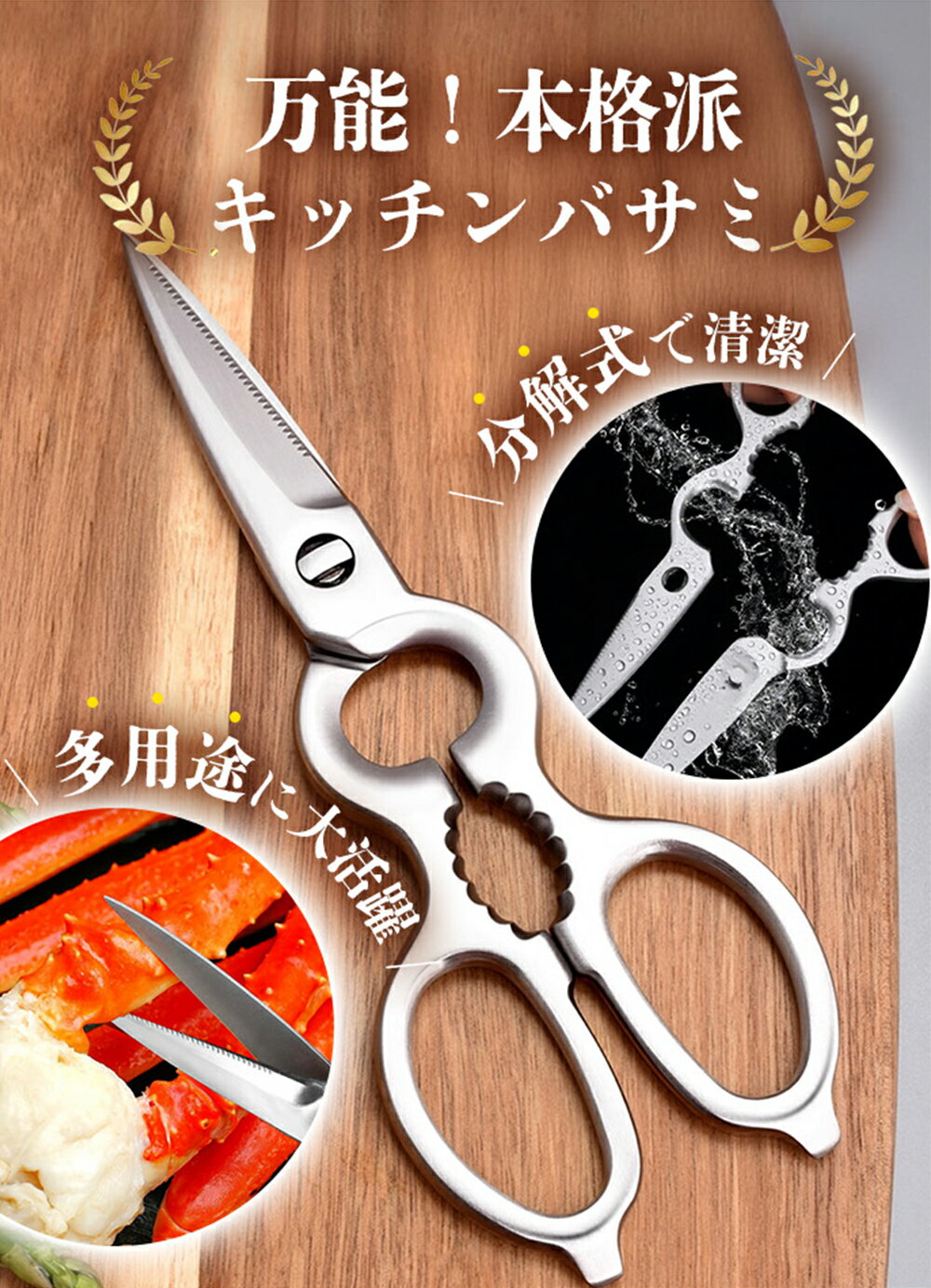 メーカー希望小売価格はメーカーサイトに基づいて掲載しています 【商品説明】 *抜群の切れ味で料理をもっと楽しく! 特別な刃先加工を施したオールステンレス製キッチンバサミ。食材をスムーズにカットできるので、料理の時短につながります。さらに、刃渡りを6.5cm→7.5cmに改良し、大きめの食材でも簡単に切れる設計。シャープな切れ味とともに、快適な調理をサポートします。 *オールステンレスだからいつでも清潔 隙間のない一体型デザインなので、汚れが溜まりにくく、お手入れも簡単。抗菌コーティングを施し、衛生面でも安心です。また、食洗機対応なので、後片付けもラクラク。毎日の料理に欠かせない衛生的なキッチンツールです。 *分解できるから洗いやすい&使いやすい 簡単に分解できる設計で、細かい部分までしっかり洗浄可能。これにより、いつでも清潔な状態をキープできます。さらに、分解すればコンパクトに収納できるため、場所を取らずスッキリ整理できるのも魅力のひとつ。 *多機能で便利!料理の幅が広がる このキッチンバサミは「カット」だけでなく、栓抜き、缶フタ開け、殻割りなどの多機能仕様。アウトドアやバーベキュー、キャンプでも活躍する万能アイテムです。ひとつ持っているだけで、キッチン作業がよりスムーズになります。 *軽量設計で手が疲れにくい 業界最軽量の140g!長時間の調理でも手が疲れにくいように設計されています。持ち手の重心を最適化し、軽い力でもスムーズにカットできるので、包丁が苦手な方や手の小さな女性にも使いやすい仕様になっています。 *プロ料理人監修の信頼品質 料理のプロが監修したこだわりのキッチンバサミ。家庭でも本格的な調理を楽しめる設計になっています。見た目もスタイリッシュで、ギフトにもおすすめ。専用のレシピブック&高級感のある外箱付きで、贈り物にもピッタリです。 *商品仕様 【素材】ステンレス鋼 【サイズ】全長:20.5cm、刃渡り:7cm、厚さ:約0.5cm。 【重量】140g 関連キーワード(商品名ではありません):キッチンばさみ キッチン ばさみ キッチン はさみ 料理はさみ 料理用ハサミ キッチンシザー 多用途はさみ ステンレスはさみ 包丁 まな板 まな板いらず 包丁いらず 多機能キッチンばさみ 高級 料理用 家庭用 1人用 フードカッター フード カッター 離乳食 介護 はさみ ヌードルカッター ステンレス ベビー 赤ちゃん 家庭キッチン レストラン シェフ 料理 はさみ キッチン シザー 分解可能 分解 できる 分解して洗える 分解して丸洗いOK 丸洗い 食洗機 食洗機対応 サビにくい 錆びにくい 切れ味抜群 精密刃 軽量 握りやすい 安全設計 長持ち 耐久性 ギザ刃 波刃 丈夫 ハードタイプ 野菜 野菜カット バーベキュー ねぎ のり 肉 肉切り 魚 魚の骨 カニ カニ用 貝殻 えび 缶切り機能 缶切り 缶詰開封 缶開け 蓋開け 栓抜き ワインボトルコルク抜き クルミ割り ナッツ割り 台所 万能ばさみ 家庭用キッチンツール 調理道具 コンパクト 超軽量 小型 プレゼント ギフト ギフト向け ギフト用 日本仕様 日本監修 japan design 料理好きへの贈り物 おしゃれ 高級感 箱付き パッケージ入り ケース ギフトボックス 新生活 引っ越し祝い 人気 レビュー高評価 新生活応援 おすすめ ランキング 女性 男性 高齢者 一人暮らし カップル 生活応援 新居 引っ越し キャンプ アウトドア アウトドア用品 キャンプ用品 便利グッズ 雑貨 便利 グッズ トラベル キャンピングカー旅行 車中泊旅行 RV旅行 旅行 年末年始 母の日 父の日 御中元 お中元 お見舞い 暑中御見舞 残暑御見舞 敬老の日 節分 卒業 卒園 バレンタインデー ホワイトデー ひな祭り お花見 ハロウィン クリスマス 冬ギフト お歳暮 御歳暮御祝 御礼 謝礼 御挨拶 粗品 贈答品 ギフト プレゼント お土産 手土産 贈りもの お返し 引き出物 お祝い 結婚祝い 結婚内祝い 出産祝い 出産内祝い 快気祝い 快気内い プチギフト 七五三 入学式 開店祝い 開業祝い 新築祝い 誕生祝い 入学祝い 就職祝い