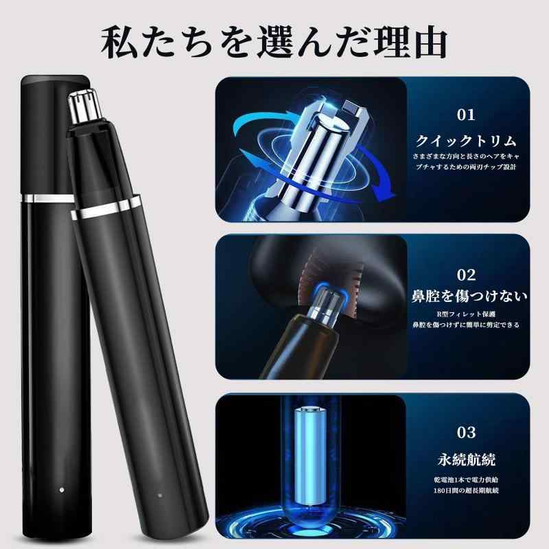 Coollooda 鼻毛カッター 1台3役 メンズ 電動シェーバー 鼻毛切り 耳毛カッター 持ち運び便利 小型 防水 水洗い可能 多機能 低騒音 掃除用ブラシ付き 男女兼用 usb充電式耳毛/ヒゲ/眉毛/ムダ毛処【鼻毛ハサミ】朝忙しいとついつい忘れがちな鼻毛処理。 出先のトイレで鼻毛がはみ出ていて困ったことはありませんか? この鼻毛トリマーはそんな悩みを解決してくれます。コンパクトで場所を取らず、持ち運びも簡単。 職場やデートで、自信に満ちた魅力的な自分を演出できます。 トリマーは最小限のノイズで動作するので、静かな環境で使用しても他の人の邪魔になりません。【USB充電と長い待機時間】鼻毛バリカンの電源が切れても、付属のUSB充電ケーブルで充電できます。 USBポート、モバイル電源、コンピュータ、USBカーチャージャーにケーブルを接続して、いつでもどこでも充電できます。 バッテリーの寿命が長く、1回の充電で最大3ヶ月間鼻毛トリマーに電力を供給できるので、安心して旅行できます。【高速360°回転とデュアルブレードデザイン】この鼻毛トリマーは高品質の精密ステンレス鋼デュアルウィングブレードとプレミアム構造で作られており、360°異なる方向に異なる長さの毛を捕捉することができます。 そして、高速回転モーターを搭載し、トリミングプロセスは、鼻毛を引っ張る現象を排除し、高速で痛みのないカットを達成し、シャープで耐久性があり、残留物なしでトリミングするために、迷子の鼻毛をキャプチャするために強力かつ正確です。【防水で持ち運びやすい】鼻毛バリカンは防水なので、安心して洗うことができます(底部の充電ポートを除く)。 鼻毛バリカンの取り外し可能な刃は分解して直接水洗いできるので、残留物や細菌の繁殖を防ぎ、常に清潔に保つことができます(本体は水洗いできますが、水に浸さないでください)。 非常に小さく、持ち運びが簡単です。 そのため、自宅だけでなく、職場や出張先、旅行先などでも持ち運ぶことができます。【様々なシーンに対応】高強度ステンレス刃で正確にトリミング。 鼻、耳、眉、ひげ、顔のムダ毛を快適かつ効率的に処理します。 敏感なワンボタンコントロールと持ち運び可能なデザインは、家庭での使用に適しているだけでなく、オフィスや出張先、旅行先への持ち運びにも便利で、どのような状況でも自信を示すことができます。 また、ご友人やご家族へのプレゼントとしてもご利用いただけます。