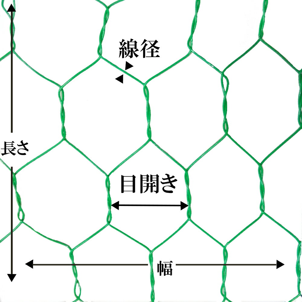 ■ビニール亀甲金網 #23 ■目開き 10mm ■線径 0.6mm ■色 グリーン ■サイズ 幅910mm×長さ30m 亀甲(きっこう)金網は、隣接する2本の線がねじり合わさって網目が形成された金網です。 工事の際に取り扱いが容易なことや、線の一部が破断しても全体に裂け広がることが少ないことから、家畜・養鶏フェンス・園芸用、建築用、鳥獣対策、獣害対策など幅広く利用されています。