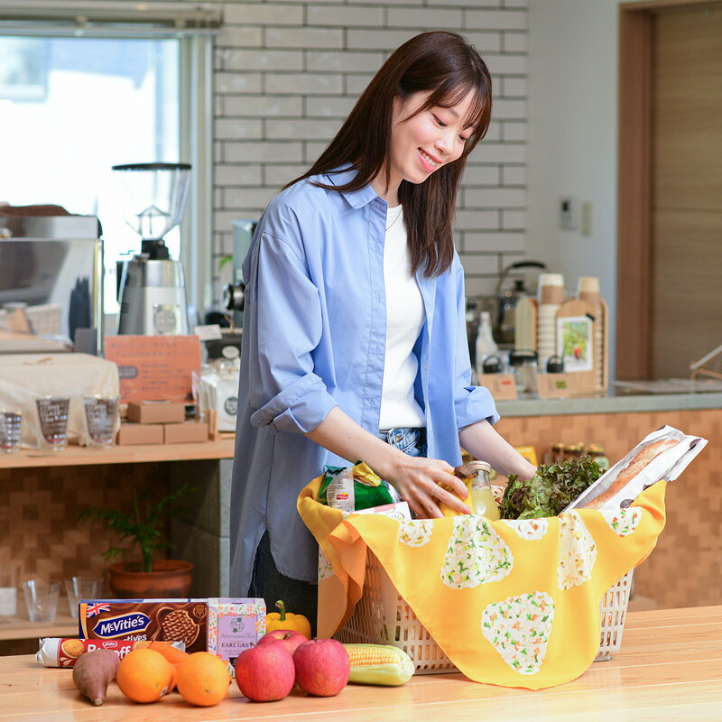 おにぎりは外に出かけるときに食べることも多い食べ物です。 よく見ると高菜やごま、じゃこなど彩り豊かなおかずがたくさん描かれています。 カラフルなまぜまぜごはんのおにぎりをお供に、明るく楽しい気持ちで風呂敷を使ってほしいという願いが込められています。 商品名 まぜまぜおにぎり サイズ 96cm×96cm(乱) 重量 105g 素材 ポリエステル100% 加工 超撥水加工『dewelry®』(日本製) 【ご注意】 ・ サイズが多少異なる場合があります。 ・ 家庭用の洗濯機で他の衣類と一緒に洗濯しても問題ありません。ただし、柔軟剤の使用は撥水機能の妨げとなりますのでお避けください。 ・ 洗剤には吸水性がありますので洗剤を付けると撥水機能は一時停止します。湯又は水で洗剤をすすぎ落としますと撥水機能は元に戻ります。 ・ 漂白剤を使用すると撥水機能が劣化してしまうので使用しないでください。 ・ 風呂敷のみの商品です。 *贈答用に、ギフトボックスがおすすめです* クリーム 150円(税込) サックス 150円(税込)