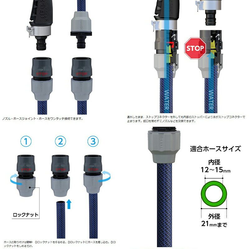 商品はご注文後2〜5営業日で発送いたします。 ※欠品等により遅れる場合は事前にご連絡いたします。取り付けはホースを差し込んで締めるだけ。 ホースやノズルの取り外しがワンタッチになる便利なアイテムです。 通水したまま取り外しても水が噴き出さないストップ機能がついています。 普通ホース(内径12-15mm/外径21mmまで)に対応。 サイズ:102×44×120mm 重量:66g