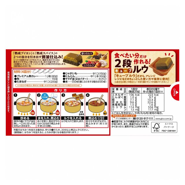熟成スパイスの香りと熟成ブイヨンのコクにより、熟成による旨みを強化しました。 個包装の「キューブルウ」だから、食べたい分だけ使えてアレンジレシピづくりや保存に便利です。 「コクのルウ」と「香りのルウ」の2段構造のルウです。 【名称】カレールウ 【原材料に含まれるアレルギー物質(28品目中)】乳成分・小麦・大豆・鶏肉・豚肉・りんご・ゼラチン・バナナ 【原材料名】 食用油脂(牛脂、ラード、パーム油)(国内製造)、コーンスターチ、小麦粉、砂糖、食塩、デキストリン、カレー粉、ポークブイヨン、りんごペースト、カカオマス、ドミグラスソース、バナナペースト、にんにくペースト、香辛料、たん白加水分解物、炒めたまねぎペースト、トマトペースト、ポークエキス、チキンブイヨンパウダー、酵母エキス、にんにくパウダー、乳等を主要原料とする食品、ポーク風味ペースト/調味料(アミノ酸等)、カラメル色素、香料、乳化剤、香辛料抽出物、(一部に乳成分・小麦・大豆・鶏肉・豚肉・りんご・ゼラチン・バナナを含む) 【栄養成分 1皿分(製品20g)当たり】 エネルギー106kcal、たんぱく質1.0g、脂質7.1g、炭水化物9.6g、食塩相当量1.5g、カリウム114mg、リン13mg 【栄養成分 表示の分量で作った場合(1皿分)※】 エネルギー223kcal、たんぱく質9.7g、脂質10.4g、炭水化物22.6g、食塩相当量1.6g、カリウム534mg、リン117mg ※ごはんを含まない。牛肉(もも肉)使用の場合。 【内容量】160g 【保存方法】直射日光をさけ、涼しい場所に保存してください。 【発売元、製造元、輸入元又は販売元】江崎グリコ株式会社 【特記】 ※商品の改訂等により、パッケージデザイン・内容量等は予告なく変更される場合がございます。 ※商品は自社店舗販売と在庫を共有しているため、在庫更新のタイミングにより、在庫切れの場合やむをえずキャンセルさせていただく可能性があります。熟成スパイスの香りと熟成ブイヨンのコクにより、熟成による旨みを強化しました。 個包装の「キューブルウ」だから、食べたい分だけ使えてアレンジレシピづくりや保存に便利です。 「コクのルウ」と「香りのルウ」の2段構造のルウです。 【名称】カレールウ 【原材料に含まれるアレルギー物質(28品目中)】乳成分・小麦・大豆・鶏肉・豚肉・りんご・ゼラチン・バナナ 【原材料名】 食用油脂(牛脂、ラード、パーム油)(国内製造)、コーンスターチ、小麦粉、砂糖、食塩、デキストリン、カレー粉、ポークブイヨン、りんごペースト、カカオマス、ドミグラスソース、バナナペースト、にんにくペースト、香辛料、たん白加水分解物、炒めたまねぎペースト、トマトペースト、ポークエキス、チキンブイヨンパウダー、酵母エキス、にんにくパウダー、乳等を主要原料とする食品、ポーク風味ペースト/調味料(アミノ酸等)、カラメル色素、香料、乳化剤、香辛料抽出物、(一部に乳成分・小麦・大豆・鶏肉・豚肉・りんご・ゼラチン・バナナを含む) 【栄養成分 1皿分(製品20g)当たり】 エネルギー106kcal、たんぱく質1.0g、脂質7.1g、炭水化物9.6g、食塩相当量1.5g、カリウム114mg、リン13mg 【栄養成分 表示の分量で作った場合(1皿分)※】 エネルギー223kcal、たんぱく質9.7g、脂質10.4g、炭水化物22.6g、食塩相当量1.6g、カリウム534mg、リン117mg ※ごはんを含まない。牛肉(もも肉)使用の場合。 【内容量】160g 【保存方法】直射日光をさけ、涼しい場所に保存してください。 【発売元、製造元、輸入元又は販売元】江崎グリコ株式会社 【特記】 ※商品の改訂等により、パッケージデザイン・内容量等は予告なく変更される場合がございます。 ※商品は自社店舗販売と在庫を共有しているため、在庫更新のタイミングにより、在庫切れの場合やむをえずキャンセルさせていただく可能性があります。