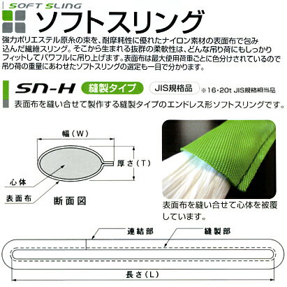※メーカー直送(受注生産)品の為、代金引換・後払い決済はご利用出来ません。 ※ご注文の際は「最大使用荷重・色」「長さ」をお選びください。 ※本品は選択項目以外の特注サイズでの製作は出来ません。 ※商品写真は最大使用荷重5.0t、縫製タイプの見本写真は最大使用荷重 2.0tの色です。お選び頂く最大使用荷重により色が異なります。 ※繊維加工品の為、表記数値と実際寸法には多少の誤差があります。 強力ポリエステル原糸の束を耐摩耗性に優れたナイロン素材の表面布で包み込んだ 繊維スリング。そこから生まれる抜群の柔軟性は、どんな吊り荷にもしっかり フィットしてパワフルに吊り上げます。表面布は最大使用荷重ごとに色分け されており吊り荷の重量に合わせた種類の選定も一目でわかります。 SN−Hシリーズは 表面布を縫い合わせて製作する縫製タイプのエンドレス形(N形)です。 種類ソフトスリング型番SN-H種類エンドレス形(N)JISJIS規格品 ※16.0t 20.0tはJIS規格相当品材質心体:ポリエステル 表面布:ナイロン 最大使用荷重表面布の色幅(W)厚さ(T)0.5t灰 34mm4mm1.0t紫 37mm5mm1.6t青 47mm6mm2.0t緑 47mm7mm3.2t黄 56mm9mm5.0t赤 67mm11mm8.0t紺 77mm14mm10.0tオレンジ 85mm16mm16.0tオレンジ110mm23mm20.0tオレンジ110mm28mm ※繊維加工品の為、表記数値と実際寸法には多少の誤差があります。 商品番号一覧 (0.5t) (1.0t) (1.6t) (2.0t) (3.2t) (5.0t) (8.0t) (10.0t) (16.0t) (20.0t) (0.5m) 30-7001 30-7021 30-7041 30-7061 30-7081 30-7101 (1.0m) 30-7002 30-7022 30-7042 30-7062 30-7082 30-7102 (1.5m) 30-7003 30-7023 30-7043 30-7063 30-7083 30-7103 (2.0m) 30-7004 30-7024 30-7044 30-7064 30-7084 30-7104 30-7124 30-7144 30-7164 30-7184 (2.5m) 30-7005 30-7025 30-7045 30-7065 30-7085 30-7105 30-7125 30-7145 30-7165 30-7185 (3.0m) 30-7006 30-7026 30-7046 30-7066 30-7086 30-7106 30-7126 30-7146 30-7166 30-7186 (3.5m) 30-7007 30-7027 30-7047 30-7067 30-7087 30-7107 30-7127 30-7147 30-7167 30-7187 (4.0m) 30-7008 30-7028 30-7048 30-7068 30-7088 30-7108 30-7128 30-7148 30-7168 30-7188 (4.5m) 30-7009 30-7029 30-7049 30-7069 30-7089 30-7109 30-7129 30-7149 30-7169 30-7189 (5.0m) 30-7010 30-7030 30-7050 30-7070 30-7090 30-7110 30-7130 30-7150 30-7170 30-7190 (5.5m) 30-7011 30-7031 30-7051 30-7071 30-7091 30-7111 30-7131 30-7151 30-7171 30-7191 (6.0m) 30-7012 30-7032 30-7052 30-7072 30-7092 30-7112 30-7132 30-7152 30-7172 30-7192 (6.5m) 30-7013 30-7033 30-7053 30-7073 30-7093 30-7113 30-7133 30-7153 30-7173 30-7193 (7.0m) 30-7014 30-7034 30-7054 30-7074 30-7094 30-7114 30-7134 30-7154 30-7174 30-7194 (7.5m) 30-7015 30-7035 30-7055 30-7075 30-7095 30-7115 30-7135 30-7155 30-7175 30-7195 (8.0m) 30-7016 30-7036 30-7056 30-7076 30-7096 30-7116 30-7136 30-7156 30-7176 30-7196 (8.5m) 30-7017 30-7037 30-7057 30-7077 30-7097 30-7117 30-7137 30-7157 30-7177 30-7197 (9.0m) 30-7018 30-7038 30-7058 30-7078 30-7098 30-7118 30-7138 30-7158 30-7178 30-7198 (9.5m) 30-7019 30-7039 30-7059 30-7079 30-7099 30-7119 30-7139 30-7159 30-7179 30-7199 (10.0m) 30-7020 30-7040 30-7060 30-7080 30-7100 30-7120 30-7140 30-7160 30-7180 30-7200