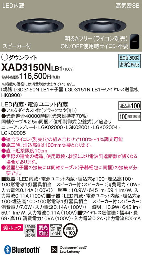 ■この器具の設置には、電気工事が必要です。電気工事の資格を持つ電気工事店・工務店等に施工をご依頼下さい。XAD3150NLB1(親機:LGD3150NLB1+子機:LGD3151NLB1+送信機:HK8900)LED(昼白色)浅型10HLED内蔵電源ユニット内蔵LED(高演色・昼白色タイプ)●適合ライトコントロール・リビングライコンNQ28752WK (別売)●適合ライトコントロール・リビングライコンNQ28752SK (別売)●適合ライトコントロール・リビングライコンNQ28732WK (別売)●適合ライトコントロール・リビングライコンNQ28732SK (別売)●適合ライトコントロール・リビングライコンNQ28751WK (別売)●同軸ケーブル2.5m同梱●■親器:LED内蔵・電源ユニット内蔵・埋込穴φ100・埋込高100・100形電球1灯器具相当 スピーカー付〈スピーカー:消費電力7.0W・入力電流0.14A(100V)〉 照明:10.9W・645 lm・59.1 lm/W、入力電流0.11A(100V)●■子器:LED内蔵・電源ユニット内蔵・埋込穴φ100・埋込高100・100形電球1灯器具相当 スピーカー付〈スピーカー:消費電力7.0W・入力電流0.14A(100V)〉 照明:10.9W・645 lm・59.1 lm/W、入力電流0.11A(100V)●■ワイヤレス送信機:幅44・長69・高16 消費電力10VA(100V)・入力電流0.2A・出力電流800mA●適合ライコン(別売)との組み合わせで100%〜1%調光可能●施工時、埋込高さは100mm必要となります。●直下近接限度10cm●実際の建物の構造、使用環境・状況により電波到達距離が短くなる場合があります。●親器と子器の接続には同軸ケーブル(子器梱包に同梱)の接続が必要です。