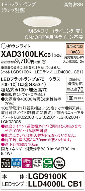 ■この器具の設置には、電気工事が必要です。電気工事の資格を持つ電気工事店・工務店等に施工をご依頼下さい。仕様・注意事項◆器具光束:700 lm ◆電圧:100 V ◆消費電力:8.4 W ◆消費効率:83.3 lm/W◆【鋼板枠】ホワイトつや消し◆天井埋込型、埋込穴φ100、浅型7H・高気密SB形・拡散タイプ(マイルド配光)◆Ra83【適合ライトコントロール】リビングライコンNQ28771W (別売)【適合ライトコントロール】リビングライコンNQ28771H (別売)【適合ライトコントロール】LED埋込逆位相調光スイッチB(ロータリー式)WT57572W(別売)【適合ライトコントロール】LED埋込逆位相調光スイッチC(ロータリー式)WTC57582W(別売)【適合ライトコントロール】LED埋込逆位相調光スイッチC(ロータリー式)(3.2A)WTC57583W(別売)【適合リニューアルプレート】LGK02000【適合リニューアルプレート】LGK02001【適合リニューアルプレート】LGK02004【適合リニューアルプレート】LGK02005◆100形電球1灯器具相当◆55度までの傾斜天井に取付可能◆位相制御式(2線式)◆入力電流(100V時):0.13 A◆適合ライコン(逆位相タイプ)(別売)との組み合わせで100%?1%調光可能◆配光については斜天井対応となっていません。◆施工時、埋込高さは70mm必要となります。◆直下近接限度10cm寸法・質量◆埋込穴径:φ100 mm ◆埋込高:70 mm光源◆LEDフラットランプφ70 クラス700 1灯(口金GX53-1) ◆色温度:2700 K ◆光源寿命40000時間(光束維持率70%)子品番【本体】LGD9100K【LEDランプ】LLD4000L CB1