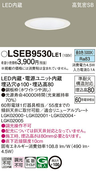 ■この器具の設置には、電気工事が必要です。電気工事の資格を持つ電気工事店・工務店等に施工をご依頼下さい。仕様・注意事項◆器具光束:490 lm ◆電圧:100 V ◆消費電力:4.5 W ◆消費効率:108.8 lm/W◆【鋼板枠】ホワイトつや消し◆天井埋込型、埋込穴φ100、浅型8H・高気密SB形・拡散タイプ(マイルド配光)◆Ra83【適合リニューアルプレート】LGK02000【適合リニューアルプレート】LGK02001【適合リニューアルプレート】LGK02004【適合リニューアルプレート】LGK02005◆60形電球1灯器具相当◆55度までの傾斜天井に取付可能◆入力電流(100V時):0.1 A◆調光操作不可◆配光については斜天井対応となっていません。◆施工時、埋込高さは80mm必要となります。◆直下近接限度10cm寸法・質量◆埋込穴径:φ100 mm ◆埋込高:80 mm光源◆LED(昼白色タイプ) ◆色温度:5000 K ◆光源寿命40000時間(光束維持率70%)ランプトランスLED内蔵電源ユニット内蔵