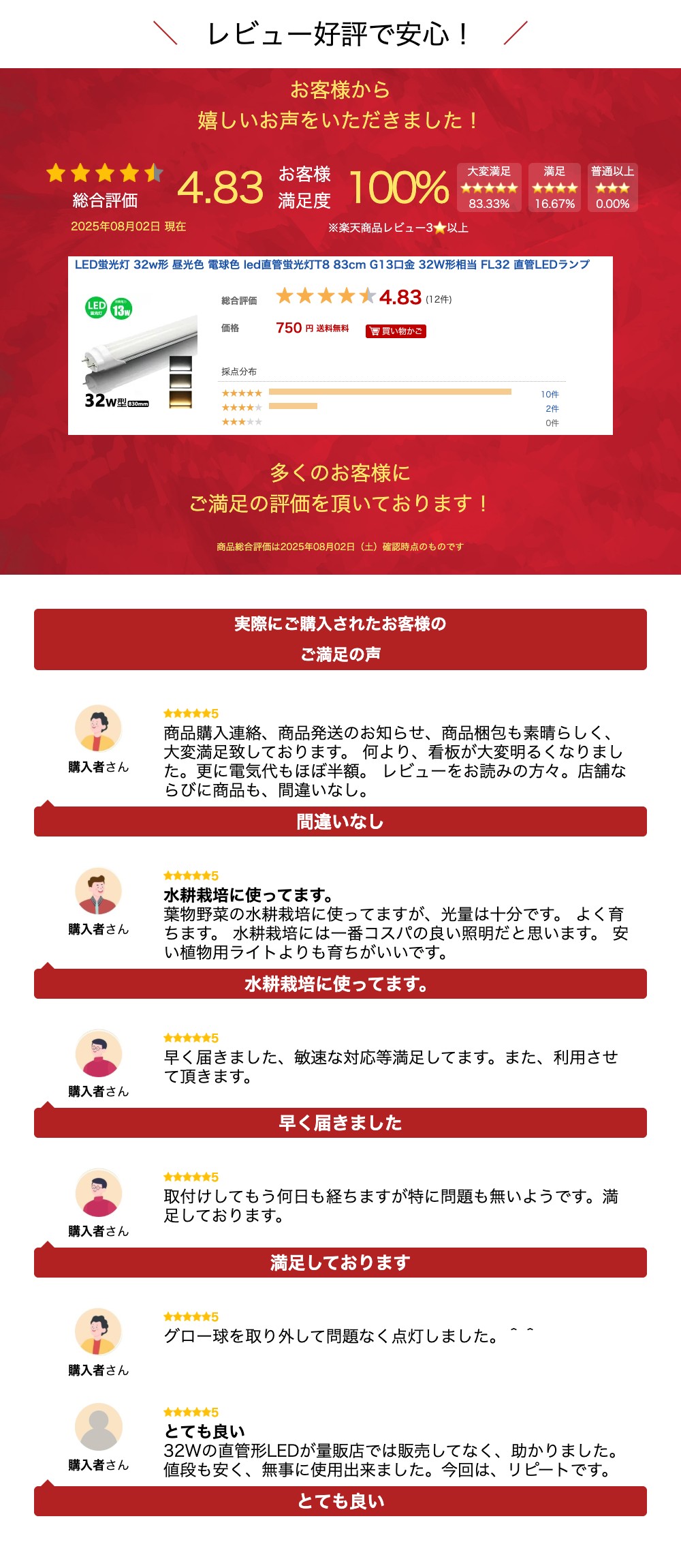 【LED蛍光灯32W型商品仕様】 ● 商品情報 ■口金:G13 ■入力:85〜250V ■周波数:50/60Hz ■消費電力:13W ■全光束:1680lm ■色温度:昼光色(6000K) 電球色(3000K) ■ビーム角:180度 ■材質:ポリカーボネイト+アルミ ■寸法:最大φ32×L830mm ■点灯方式:グロー式対応 両側直結対応 ■定格寿命:40,000時間 ● 注意事項 ※お使いの器具がグロースターター式の場合は、必ずグロー球を外すしてください。 ※グローランプの付いていないラピットスタート方式、インバーター(電子安定器)方式の場合は、直結工事が必要です。最寄りの電気店にご相談ください。 ※同じ器具で従来の蛍光灯とLED蛍光灯は併用して使用しないでください。 ※調光機能や自動点滅器が付いて回路は取り付けないでください。  関連商品【楽天1位 6冠達成】led蛍光灯 40w形 直管 昼光色 昼白色 電...LED蛍光灯 30w形 昼光色 電球色 led直管蛍光灯T8 63cm...【楽天1位 6冠達成】LED蛍光灯 20w形 昼光色 昼白色 電球色 ...698円670円510円led蛍光灯 40w形 直管 高輝度タイプ 昼光色 led直管蛍光灯T...LED蛍光灯 40w形 広角300度 昼光色 昼白色 電球色 led直...【楽天1位 6冠達成】led蛍光灯 110w形 口金R17D G13兼...980円780円4,780円led蛍光灯 40w形 直管 昼光色 昼白色 電球色 led直管蛍光灯...LED蛍光灯 15w形 昼光色 電球色 led直管蛍光灯T8 44cm...【楽天1位 6冠達成】led蛍光灯器具 逆富士 40w 2灯 led蛍...7,500円530円3,750円LED蛍光灯器具一体型 T5 led 拡散連結可器具一体形LED直管蛍...LED ベースライト 逆富士 40W型 逆富士 35w 2灯 led ...LED蛍光灯 10w形 昼光色 電球色 led直管蛍光灯T8 33cm...1,480円3,980円498円