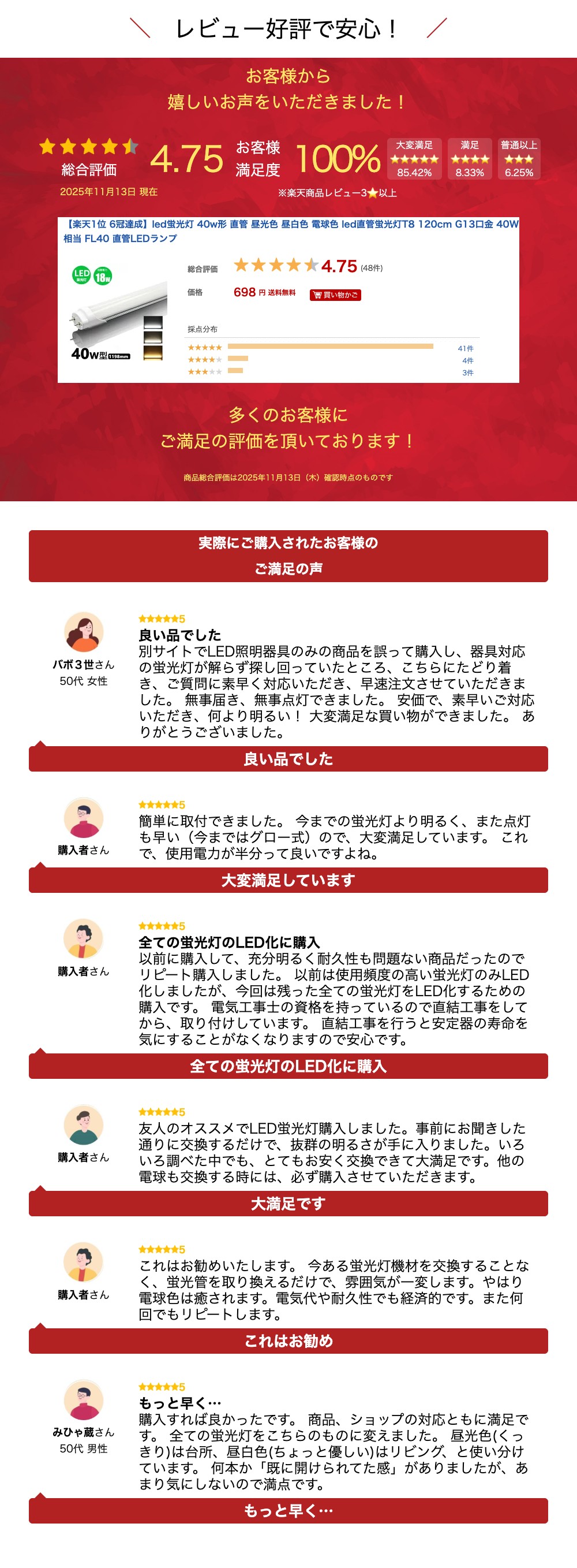 【LED蛍光灯40W型商品仕様】 ● 商品情報 ブランド:NISSIN LUX ■口金:G13 ■入力:85〜250V ■周波数:50/60Hz ■消費電力:18W ■全光束:2200lm ■色温度:昼光色(6000K) 昼白色(5000K) 電球色(3000K) ■ビーム角:180度 ■材質:ポリカーボネイト+アルミ ■寸法:最大φ32×L1198mm ■点灯方式:グロー式対応 両側直結対応 ■定格寿命:40,000時間 ● 注意事項 ※お使いの器具がグロースターター式の場合は、必ずグロー球を外すしてください。 ※グローランプの付いていないラピットスタート方式、インバーター(電子安定器)方式の場合は、直結工事が必要です。最寄りの電気店にご相談ください。 ※同じ器具で従来の蛍光灯とLED蛍光灯は併用して使用しないでください。 ※調光機能や自動点滅器が付いて回路は取り付けないでください。  関連商品LED蛍光灯 30w形 昼光色 電球色 led直管蛍光灯T8 63cm...LED蛍光灯 32w形 昼光色 電球色 led直管蛍光灯T8 83cm...led蛍光灯 40w形 直管 高輝度タイプ 昼光色 led直管蛍光灯T...670円750円980円led蛍光灯 40w形 直管 昼光色 昼白色 電球色 led直管蛍光灯...【楽天1位 6冠達成】LED蛍光灯 20w形 昼光色 昼白色 電球色 ...LED蛍光灯 40w形 広角300度 昼光色 昼白色 電球色 led直...7,500円510円780円【楽天1位 6冠達成】led蛍光灯 110w形 口金R17D G13兼...led蛍光灯 40w形 直管 昼光色 昼白色 電球色 led直管蛍光灯...LED蛍光灯 40w形 片側配線 led直管蛍光灯T8 120cm G...4,780円21,600円25,500円LED蛍光灯器具一体型 T5 led 拡散連結可器具一体形LED直管蛍...LED蛍光灯 15w形 昼光色 電球色 led直管蛍光灯T8 44cm...【楽天1位 6冠達成】led蛍光灯器具 逆富士 40w 2灯 led蛍...1,480円530円3,750円