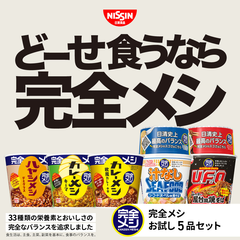 栄養とおいしさの完全なバランスを追求した「完全メシ」! ビタミン・ミネラル・必須脂肪酸もバランス良く整え、味はおいしく仕上げました。 お湯かけ5分で完成する「カレーメシ」や「日清焼きそばU.F.O.」など、お馴染みのブランドの完全メシを一度にお試しできるセット! 日清食品が培ってきた様々な食品開発技術を駆使し、栄養とおいしさの完全バランスを実現する新発明をぜひ体験してください。 ※「日本人の食事摂取基準」(2020年版) において日本人が摂取すべき量が定められたすべての栄養素 完全メシ カレーメシ:429円(税込) 完全メシ キーマカレーメシ:429円(税込) 完全メシ ハヤシメシ:429円(税込) 完全メシ カップラーメン 汁なしシーフードヌードル:429円(税込) 完全メシ 日清焼そばU.F.O.ぶっ濃い屋台風焼そば :429円(税込) 通常合計価格 2,145円(税込)のところ1,980円(税込)! 完全メシ カレーメシ 欧風カレー 原材料・栄養成分・アレルゲン・賞味期限について 詳しくはこちら » 完全メシ キーマカレーメシ 原材料・栄養成分・アレルゲン・賞味期限について 詳しくはこちら » 完全メシ ハヤシメシ 原材料・栄養成分・アレルゲン・賞味期限について 詳しくはこちら » 完全メシ カップラーメン 汁なしシーフードヌードル 原材料・栄養成分・アレルゲン・賞味期限について 詳しくはこちら » 完全メシ 日清焼そばU.F.O.ぶっ濃い屋台風焼そば 原材料・栄養成分・アレルゲン・賞味期限について 詳しくはこちら » お得な情報を見逃すな!開催中のキャンペーン ※対象商品割引クーポンはご注文1回に限り、1商品まで適用となります。