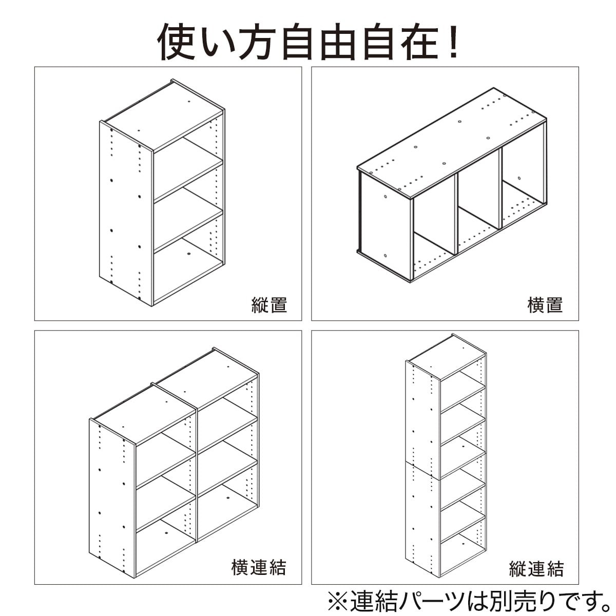 ●タテ・ヨコ連結できるカラーボックス●同じ幅の商品は上下に連結できます。※縦ジョイントパーツ(別売り)が必要です。※積み重ねは2個まで可●同じ高さの商品は左右に連結できます。※横ジョイントパーツ(別売り)が必要です。【セット内容】●2段タイプ連結できるNカラボ レギュラー2段 ×1点●3段タイプ連結できるNカラボ レギュラー3段 ×1点●4段タイプ連結できるNカラボ レギュラー 2段 ×2点連結できるNカラボ用 縦ジョイントパーツ ×1点●5段タイプ連結できるNカラボ レギュラー 2段 ×1点連結できるNカラボ レギュラー3段 ×1点連結できるNカラボ用 縦ジョイントパーツ ×1点●6段タイプ連結できるNカラボ レギュラー 3段 ×2点連結できるNカラボ用 縦ジョイントパーツ ×1点【お客様組立品】●プラスドライバー必要●組立てパーツ在中【耐荷重(約)】棚板1枚あたり:10kg【サイズ(約)】●2段タイプ外寸:幅41.9×奥行29.8×高さ59cm内寸:幅39×奥行28×高さ56cm●3段タイプ外寸:幅41.9×奥行29.8×高さ87.8cm内寸:幅39×奥行28×高さ85cm棚板の厚さ(2段タイプ、3段タイプ共通):12mm(※側板も共通)棚ピッチ(棚穴の間隔):32mm【材質】パーティクルボードホワイトウォッシュ/8842174ライトブラウン/8842192ミドルブラウン/8842209ブラック/8842231主な素材:パーティクルボードサイズ(約):幅41.9×奥行29.8×高さ87.8cm保証年数:1年重量:約8.8kg組立時間目安:20分納品方法:玄関先迄納品 日時指定について8842173-0000002| 8842191-0000002| 8842208-0000002| 8842229-0000002|8842174|8842192|8842209|8842231|8842208|8842229