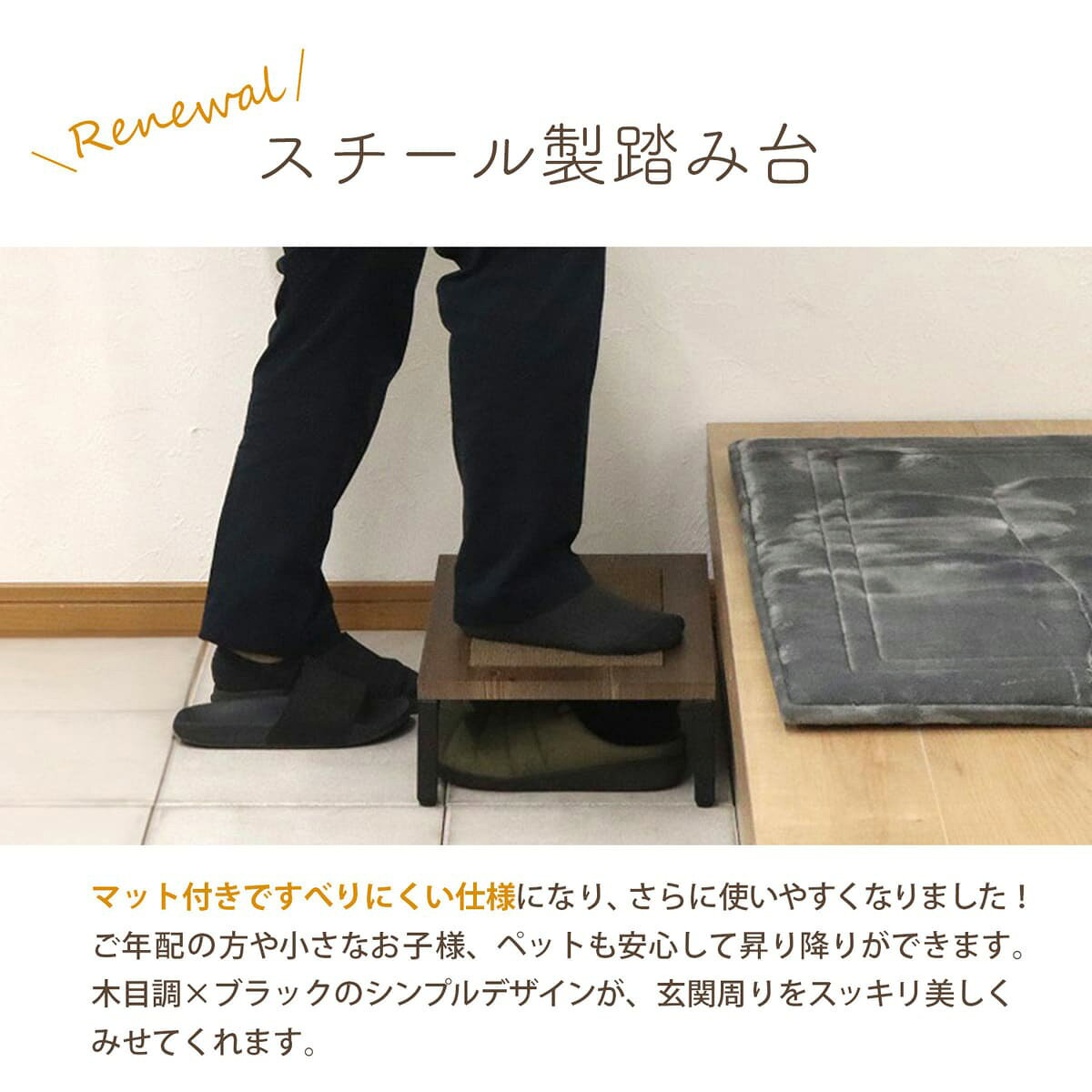 ●毎日の暮らしの中で、ちょっとした段差の解消に大活躍。 ●年配の方や小さなお子様、ペットも、安心して玄関の昇り降りができます。 ●天板上のマットは厚さ4mm。寒い時期でもヒヤッとしません。 ●マット裏はゴム製で滑りにくくなっており、安全にお使いいただけます。 ●木目調×ブラックのシンプルデザインが、玄関周りをスッキリ美しく見せてくれます。 ●天板下には靴やスリッパなどを2足ほど収納できるので、玄関スペースを有効活用できます。(内寸幅41cm) ●耐荷重は90kg。天板の裏側をスチールフレームで補強しており、しっかりとしたつくりで安定感があります。 ●脚部分にはアジャスターが付いており、ガタツキを軽減することができます。 ※こちらはメーカー直送商品です。納品方法:玄関先迄納品日時指定について4932528023857|4932528023864