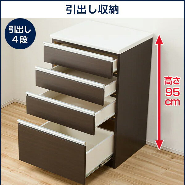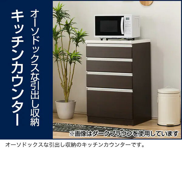 オーソドックスな引出し収納のキッチンカウンターです。【通常レールタイプ】取っ手がスタイリッシュな印象の引出し。たっぷりの収納力で、キッチン周りをスッキリ整理。引出しの最下段は奥の物が出し入れしやすいフルスライドレール仕様です。【ソフトクローズタイプ】引出しに世界的メーカーヘティヒ社と共同開発したレールを使用しています。全段奥の物が出し入れしやすいフルオープンタイプ、また耐久性の高い底受け構造レールが引出しの荷重を分散して受け止めます。引出しの1・2段目は、押すだけでゆっくり閉まるソフトクローズ仕様の高機能レールです。【詳細サイズ(約)】〔通常レール・ハイタイプ〕引出し内寸1段目:幅50.5×奥行43.5×高さ15(有効内寸9)cm2段目:幅50.5奥行43.5×高さ15(有効内寸10.5)cm3段目:幅50.5×奥行43.5×高さ17(有効内寸12.5)cm最下段:幅50.5×奥行43.5×高さ33(有効内寸28)cm〔通常レール・ロータイプ〕引出し内寸1段目:幅49×奥行43.5×高さ16(有効内寸10)cm2段目:幅49×奥行43.5×高さ23(有効内寸17)cm最下段:幅49×奥行43.5×高さ35(有効内寸30)cm〔ソフトクローズ・ハイタイプ〕引出し内寸1段目:幅49×奥行43.5×高さ15(有効内寸9)cm2段目:幅49×奥行43.5×高さ15(有効内寸10.5)cm3段目:幅49×奥行43.5×高さ17(有効内寸12.5)cm最下段:幅49×奥行43.5×高さ33(有効内寸28)cm〔ソフトクローズ・ロータイプ〕引出し内寸1段目:幅50.5×奥行43.5×高さ16(有効内寸10)cm2段目:幅50.5×奥行43.5×高さ23(有効内寸17)cm最下段:幅50.5×奥行43.5×高さ35(有効内寸30)cm色:ホワイト|ダークブラウン主な素材:繊維板サイズ(約):幅60×奥行51×高さ95cm保証年数:5年組立納品方法:配送員設置・梱包材回収大型家具の納品について日時指定について4033030| 4033090| 4033040| 4033100| 4033050| 4033110| 4033060| 4033120