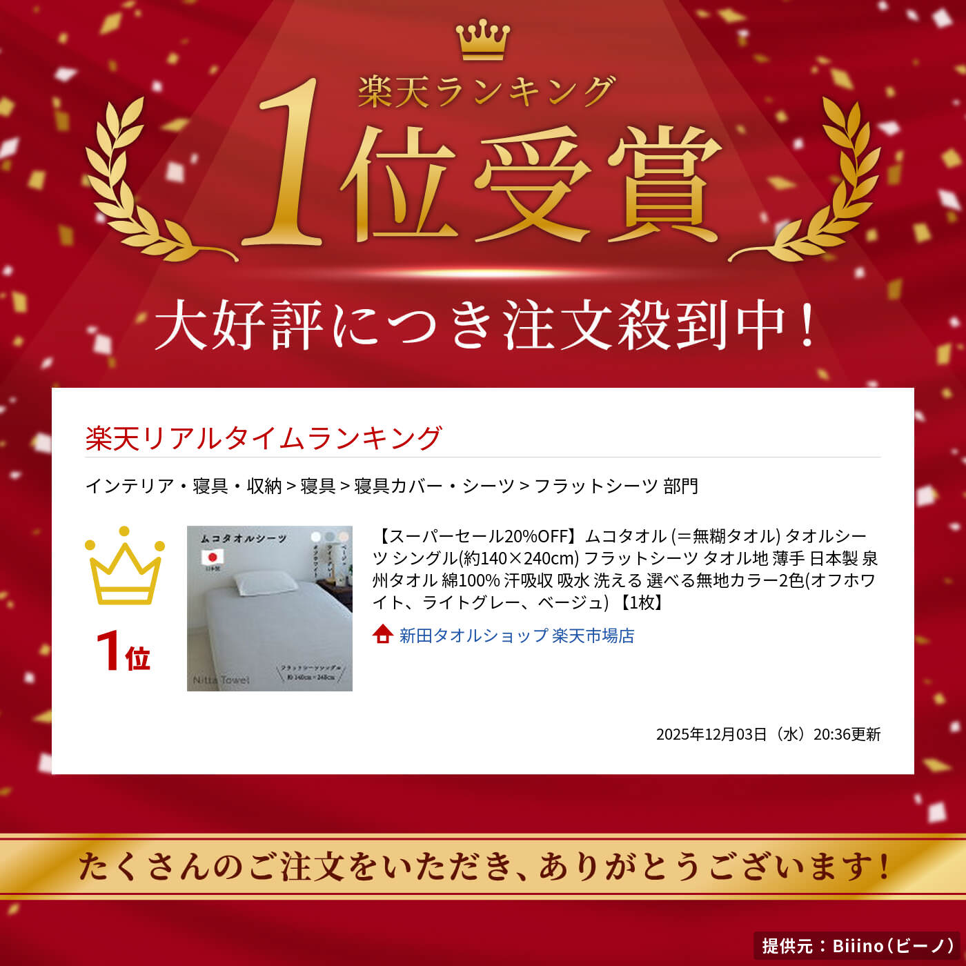 【スーパーセール20%OFF】ムコタオル (=無糊タオル) タオルシーツ シングル(約140×240cm) フラットシーツ タオル地 薄手 日本製 泉州タオル 綿100% 汗吸収 吸水 洗える 選べる無地カラー2色(オフホワイト、ライトグレー、ベージュ) 【1枚】