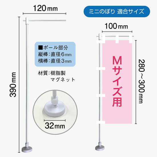 在庫があれば即日〜翌営業日発送の手配が可能です。注文数が在庫数より多い場合はお時間を頂戴しております。ご不安な場合はご注文前にお問い合わせください。 ※在庫が不足していた場合は、商品入荷後に発送いたします。(即日発送・納期短縮はできかねます) 【商品仕様】 ●サイズ:W120×H390mm(直径:横棒3mm 縦棒6mm マグネット32mm) ●材質:樹脂製、マグネット ●適合ミニのぼりサイズ:W100×H300mm(Mサイズ) 土台がマグネットになったタイプです。マグネットがくっつく場所であれば、垂直面でもご利用いただけます。 土台とマグネットの結合部にあるジョイントは90度まで角度調整が可能です。(欠けのある方向のみ) ポール上部についている横棒は取り外しが可能なタイプです。 【ご注意事項】 ●本商品はミニのぼり用ポール単体の販売です。ミニのぼりは付属しておりません。 Mサイズ取り付けイメージ 同サイズ用の器具はこちら ピアノ線タイプ 吸盤タイプ 平台タイプ クリップタイプのぼりストアは豊富なデザインの商品を取り揃えております! 集客効果のある高品質で格安のミニのぼり旗を工場直送で全国に発送いたします。 取り付け用の器具もぜひご一緒にお買い求めください。
