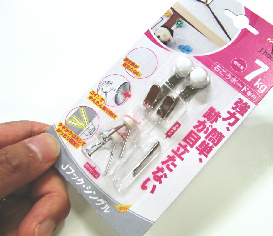 ■ 用途と特長 ■ 「壁に素敵な絵を飾りたいわ!でも賃貸だから壁への傷は最小限にしたい・・・。」 「この額、けっこう重いから、耐荷重が高い方がいいなあ。」 「このお気に入りの壁掛け時計、落ちたら大ショックだからしっかりかけたい!」 そんなときにはこちらの石こうクギがおすすめです! 世界初マジッククロス8システム(釘がクロスして壁にガッチリ固定するシステム)で、 シングルタイプにして、最大垂直荷重7Kgという力強さ! フックや取り付けピースが小さいので、目立ちません。小さくても力持ちです♪ 取り付け・取り外しは非常に簡単&スピーディーにできます。 コインを使用して押し込み、取り付けることができます。 また、外しても壁には小さな跡しか残りません。 【用途】壁面用(石膏ボード専用フック) 壁面専用なので、天井面では使用しないで下さい。 【使用例】額縁、掛け時計、カレンダー、キーホルダー、壁掛け小物、ダーツボード等 【使用強度・必要な工具】 【取り付け方法・仕様】 フック先端部分の幅5ミリ 最大垂直荷重7Kg 日本軽金属グループの不二貿易の製品です。 フック2個入りです。 【関連商品】石こうボード奥が空洞位置でも取り付けできるフックシリーズ 吊り金具のコーナー / ビラカン / かなづち 念のため、外した後の穴うめをしたい方は、ペンタイプの塗料で塗ったり、 穴うめパテを利用するのがオススメ(白い壁紙の場合) メール便でのご送付につきまして。