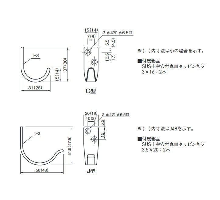 シンプルで飽きのこない定番デザインのフックです。 お手頃価格な割にはサテン仕上げのステンレスですので、 安っぽい感じがありません。 C型大 163-426[サイズ]37mm×15mm [本体重量]17g [付属品]SUS十字穴付丸皿タッピンネジ3×16:2本 [材質]ステンレスSUS304 [仕上]サテン [耐荷重]25kgf C型小 163-427[サイズ]30mm×14mm [本体重量]13g [付属品]SUS十字穴付丸皿タッピンネジ3×16:2本 [材質]ステンレスSUS304 [仕上]サテン [耐荷重]25kgf 直径12ミリ以上の穴があるものを引っ掛けることができます。 J型58大 163-446[サイズ]51.5mm×58mm [本体重量]35g [付属品]SUS十字穴付丸皿タッピンネジ3.5×20:2本 [材質]SUS304 [仕上]サテン [耐荷重]20kgf J型48小 163-447[サイズ]47.5mm×48mm [本体重量]28g [付属品]SUS十字穴付丸皿タッピンネジ3.5×20:2本 [材質]SUS304 [仕上]サテン [耐荷重]20kgf 杉田エース/ACEの製品です。 【関連商品】 三方の錐(下穴を開ける用) / ドライバー2番 スピードミニ(石こうボードの位置に付ける場合は併用してください) スガツネ製の鏡面仕上げシンプルなフック 吊り金具・フックのコーナー
