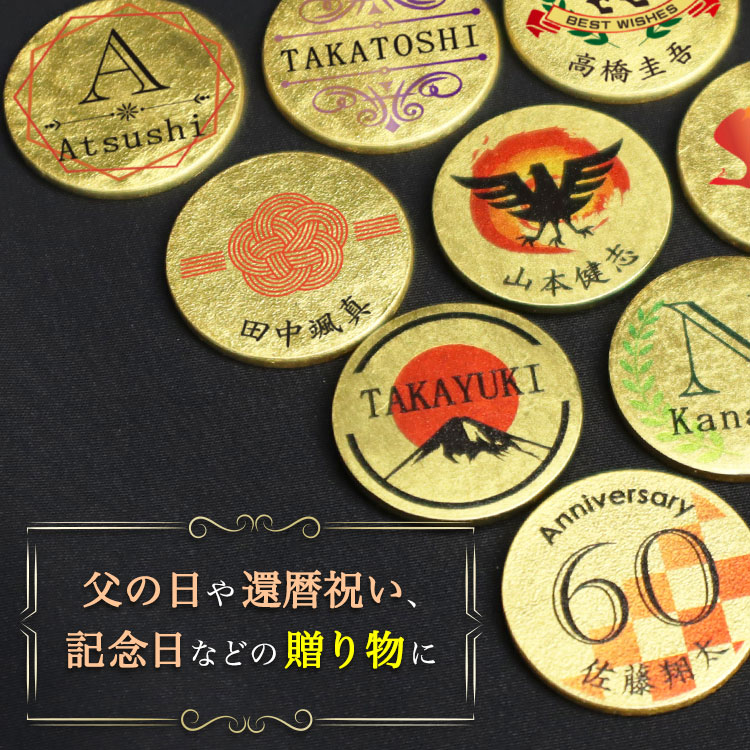 商品詳細 商品 名入れ金箔ゴルフマーカー&楕円型ハットクリップ(ゴールド) マーカー 素材:ステンレス、金沢金箔(金箔四号色) サイズ:直径約25mm ※表面と側面に箔加工+コーティング加工 金箔メーカー 箔座 ハットクリップ サイズ:横幅約47mm ※台座部分にネオジウム磁石を内蔵 ※台座部分に印字されている文字・文字色は変更不可 名入れについて 日本語・英字に対応 対応文字数:漢字6文字、英字9文字まで ※お名前・イニシャルのフォントや文字色を変更する事は出来ません。 ※書体の特徴により、点画の数や字形がパソコンやスマホ上で表示される文字とは異なります。 ※漢字の旧字体はそのまま入力すると文字化けします。「高橋(高ははしごだか)」のように入力ください。 のし&メッセージカード ※こちらの商品はのし、メッセージカードには対応しておりません。 納期 約3〜5営業日 ご注意 ※金沢金箔は、マーカーの表面と側面に施しております。箔が剥がれないようコーティング加工で仕上げています。 ※用途以外でのご使用はお控えください。 ※お子様の手の届かないところに保管してください。 ※ご記入頂いた内容をそのまま印刷致しますので、誤字・ 脱字にご注意下さい。 ≪季節のお祝い・祝事≫ 母の日 父の日 クリスマス 敬老の日 ホワイトデイ バレンタイン誕生日 結婚お祝い ゴルフコンペ コンペ景品 セット ゴルフギフト ゴルフ小物 ラウンド用品 ゴルフグッズ ゴルフ マーカー ゴルフマーカー ボールマーカー 目印 名入れ 名前入り イニシャル 金沢 金沢金箔 金箔マーカー 伝統工芸 工芸品 ゴールド 純金 ボールマーク おしゃれ かっこいい デザイン ゴルフボール マグネット キラキララウンドする際の必須携帯アイテム「ゴルフマーカー」 金沢金箔を贅沢に使用し、名前を入れた自分だけの特別なゴルフマーカー。 専用のハットクリップ付きなので、プレー中に無くす心配はありません。 華やかな金箔ゴルフマーカーで ゴルフがもっと楽しく!おしゃれに!特別に! 太陽の光を浴びると、 金箔が上品で美しい輝きを放ちます。 ゴルフマーカーには名入れとデザイン印刷が可能♪ デザインは上品でエレガントなデザインから 日本らしい和風のデザインなどを ご用意しております。 贈られた方はもちろん、 贈った方も笑顔になります♪ 全国シェア99%を誇る、 石川県金沢の伝統工芸『金沢箔』を 職人が一つ一つ丁寧に 表面と側面に施した逸品。 金箔が剥がれないように コーティングも施しております。 金沢の伝統美輝く 金箔ゴルフマーカー。 幸運を招く縁起物の金箔は、 贈り物に最適 金箔ゴルフマーカーに合う 楕円型のハットクリップ付き!! 帽子のツバにしっかり挟め プレイ中に外れる心配なし!! ラッピングも無料で対応!! そのままお渡しできるよう、 ギフトBOXに入れ、リボンラッピングをして お手元にお届け致します。 ≪季節のお祝い・祝事≫ 母の日 父の日 クリスマス 敬老の日 ホワイトデイ バレンタイン誕生日 結婚お祝い ゴルフコンペ コンペ景品 セット ゴルフギフト ゴルフ小物 ラウンド用品 ゴルフグッズ ゴルフ マーカー ゴルフマーカー ボールマーカー 目印 名入れ 名前入り イニシャル 金沢 金沢金箔 金箔マーカー 伝統工芸 工芸品 ゴールド 純金 ボールマーク おしゃれ かっこいい デザイン ゴルフボール マグネット キラキラ