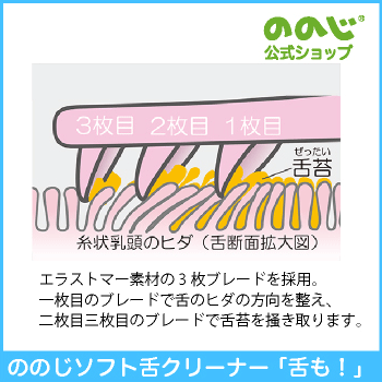■ ご注文の前にお読みください ■ 私たち『ののじ』は、日ごろ何気なく手にしているアイテムにこだわっています。いつも使うアイテムだから、お得にお届けできるよう 複数の配送方法にて発送しております。 <ゆうパケットでお届けする商品> ■商品名に【ゆうパケット対象】の記載あり送料無料の商品の場合、「宅配便」をご選択いただいても、「ゆうパケット」にてお届けいたします。複数の商品をご購入いただき既定サイズ(厚さ3cm、250g以内)を超える場合、「宅配便」にてお届けいたします。■商品名に【宅配便対象】の記載あり「宅配便(ヤマト運輸または佐川急便)」にてお届けいたします。「ゆうパケット」と「宅配便」の商品を一緒にご注文いただいた場合、「宅配便」にてお届けいたします。 <ゆうパケットから宅配便へ変更した場合の送料> ■送料無料の商品 「宅配便」へ変更後も送料無料にてお届けいたします。■送料別の商品「宅配便」の送料にてお届けいたします。。北海道〜九州:550円、沖縄・離島:2,420円送料無料の商品を一緒にご注文いただいた場合は、送料無料にてお届けいたします。※沖縄・離島は、送料無料・送料別の表記に関わらず、宅急便対象の商品につきましては2,420円の送料を頂戴しております。 ■ ご注文後の住所変更につきまして ■ 原則、ご注文受付後の住所変更は承っておりません。必ずご注文前に確認をお願いいたします。商品発送後に住所変更をご希望の場合、発生した転送料を別途ご負担いただきますので、ご了承ください。 ■ ギフト包装につきまして ■ こちらの商品のギフト包装は対応しておりません。 歯科専門医共同開発品。 2009年グッドデザイン賞受賞。 品 番 STM-01P3/C(ピンク)、STM-01G3/C(グリーン)、STM-01B3/C(ブルー) 内 容 舌も!本体3本+専用ケース1個 色 ピンク、グリーン、ブルー サイズ 約12.7×2.5×1.5cm 重 量 約10g 素 材 クリーナー:TPE(抗菌剤配合) 専用ケース:PP,TPE(抗菌剤配合) 耐熱温度 クリーナー:80℃ 専用ケース:80℃ 生産国 日本 【メディア掲載歴】 2020/5/28 雑誌「毎日が発見!6月号 プレゼント」 1本で買うよりとってもお得な3本セット!\ なんと!1本あたり220円もお得! /舌も!本体×3本 + 専用ケース1個付き 「ソフト舌クリーナー舌も!」は、独自の3枚ブレードが特徴です。 デリケートな舌を傷つけることなく舌の汚れをスッキリと除去できる歯科医が自信をもって薦める舌クリーナーです。 舌の表面は糸状乳頭と呼ぶヒダに覆われています。 このヒダには食べかすなどの汚れにより舌苔(ぜったい)と呼ばれる細菌の巣が発生します。 これらの細菌はインフルエンザなどのウイルスを繁殖させる仕組みを持っています。 したがって舌を清潔に保つことは健康管理上とても重要です。 また舌苔は歯ブラシでは落としにくい性質を持っており、専用器具を使うことが望ましいとされています。 舌の奥から手前に向けて、汚れを掻き出します。 適度な弾力を持つエラストマー素材の3枚ブレードを採用。一枚目のブレードで舌のヒダの方向を整え、二枚目三枚目のブレードで舌苔を掻き取ります。 スリムな本体を採用し、適度なしなりと柔らかさを持ち、舌にフィットします。 このため舌の奥に突っ込んだときに、無理な力がかかりすぎて発生しがちだった「オエッ」(吐き気)とならないよう科学しました。 ※ ブラシタイプと異なり、流水だけでブレードの間から汚れをさっと洗い流すことができます。 携帯に便利な専用ケース付き。 エチケットにも最適。 舌苔は寝ている間に繁殖します。 朝起き一番の舌磨きを習慣付けましょう! ※吐き気の発生には個人差があります。 歯科専門医共同開発品。 2009年グッドデザイン賞受賞。 ※モニターの発色の具合によって色の見え方が若干異なる場合がございます。 free shipping数量限定!楽天市場で初めてお買い物の方限定!1,000ポイントプレゼント!