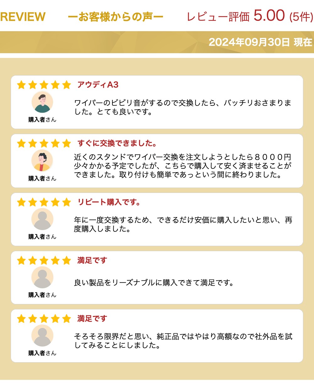 ★適合確認はこちらをクリック輸入車 > ワイパーブレード > エアロツインを選択 \適合がご不明な場合はお調べします!/【商品についてお問い合わせする】よりメーカー・車種・17桁の車台番号をご連絡ください。お調べして回答致します。 あす楽 対応商品です。 【ご利用条件】 月曜日-土曜日13時までのご注文で明日お届けします。 月曜日-土曜日13時以降及び日・祝祭日、年末年始などは、休業日明けの発送となります。 【翌日配達可能エリア】 関東 [栃木 |群馬 |埼玉 |千葉 |東京 |神奈川 |山梨 ] 信越・北陸 [新潟 |富山 |石川 |福井 |長野 ] 東海 [岐阜 |静岡 |愛知 |三重 ] 近畿 [滋賀 |京都 |大阪 |兵庫 |奈良 |和歌山 ]関連商品BOSCH ワイパー AUDI A3 [8PA][8P1]A3 1.4...BOSCH ワイパー AUDI アウディ A4 / A4アバント / ...3,957円3,957円BOSCH ワイパー Audi アウディA1 運転席 助手席 左右 2...BOSCH ワイパー Audiアウディ Q5 運転席 助手席 左右 2...3,957円3,957円BOSCH ワイパー Audiアウディ A6 運転席 助手席 左右 2...BOSCH ワイパー A937S アウディ A3 (8P1) 車種専用...4,242円4,052円BOSCH ワイパー A937S アウディ A3 ( 8PA ) 車種...BOSCH ワイパー BMW 5シリーズ [F10] [F11] ...4,052円4,042円BOSCH ワイパー プジョー 208 運転席 助手席 左右 2本 セ...BOSCH ワイパー ゴルフ7 [5G1] 1.2 TSI 運転席 ...4,042円4,042円アウディ A3 セダン (8V1 8VS) / A3スポーツバック (8VA) Aerotwin エアロツイン 運転席・助手席、左右セット販売用ページです。 【適合情報】 モデル名 型式/年式 A3セダン 1.4 TFSIDBA-8VCPTL/13.01-16.11 A3セダン 1.8 FSI クワトロABA-8VCJSL/12.08-16.08 A3セダン 1.4 TFSIDBA-8VCXSL/13.09-16.08 A3セダン 2.0 TFSI クワトロABA-8VCZPL/16.05-20.10 A3 1.4 TFSI スポーツバックDBA-8VCPT/13.02-16.11 A3 1.4 TFSI スポーツバックABA-8VCXS, DBA-8VCXS/13.05-20.10 A3 1.4 TFSI スポーツバック e-tronDLA-8VCUK/14.05-20.10 A3 1.8 TFSI スポーツバッククワトロABA-8VCJSF/13.05-16.08 A3 2.0 TFSI スポーツバッククワトロABA-8VCZPF/16.05-20.10 ※U字フックには対応しておりません。 ・アームタイプ:C ・アダプター:4 ・ご購入後の適合不可の理由での返品は承っておりません。 適合がご不明な場合はお調べした履歴を残すために【商品についてお問い合わせする】よりお問い合わせをお願いいたします。 1本売りのページはこちらです。 AP26Uの単品商品ページはこちら AP18Uの単品商品ページはこちら ポリマーコーティングゴムの採用で、雨天時での運転をより安全に、より快適に。 ■拭取り性能アップ 新開発のポリマーコーティングゴムの採用により、すぐれた拭取り性能を実現。豪雨時でもクリアな視界をキープします。 ■製品寿命アップ ポリマーコーティングを施したことで、ワイパーゴムの耐久性がさらに上がり、製品寿命が大幅にアップ。寒暖の差にも強く、あらゆるシチュエーションですぐれたパフォーマンスを発揮します。 ■静粛性能アップ 新開発ゴムの採用により、摩擦が大幅に抑えられ静粛性能がアップ。小雨時でガラス面が半乾きの状態でもスムーズに動き、不快な振動やビビリ音も低減します。 ■エアロダイナミックフォルム スポイラー付きのフォルムは、空気抵抗による浮き上がりを押さえ、マイナスリフトを実現。フロントガラスへの密着性が向上し、高速走行時でも確実な払拭性能を発揮、風切り音を大幅に低減しました。""インテリジェントテンションストリップBosch 独自のジョイントレスバーテブラ。 ■ガラス面への接地圧力分布(エアロツイン680mm) フラット型では、アーチ状のスプリング全体でラバーを押し付けるため、面圧分布が均等になりやすい。特にウインドウ曲面に影響される両端は押し付け圧が確保しやすい。 ■ガラス面への接地圧力分布(従来品680mm) トーナメント型はラバーとの接続部が3-8点あり、そこから押し付け力が分散するため、面圧にムラがでる。特に劣化時に影響が発生して、シマ模様の拭きムラが起こりやすい。 交換方法はこちらをご参照下さい。