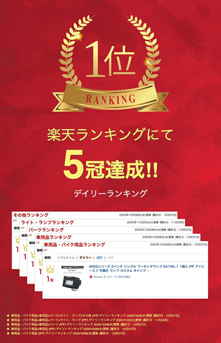 ⚠配送に関して メーカー在庫欠品時には、記載納期よりもお時間がかかる場合がございます。この場合には納期を別途ご案内させていただきます。お急ぎのお客様はご注文の前にお問い合わせください。 ⚠返品・交換に関するご案内 お客様都合による返品・交換不可: 商品発送後の返品や交換は、お客様のご都合による場合はお受けできません。商品の詳細については、ご注文前に十分にご確認いただきますようお願い申し上げます。 ⚠沖縄県・離島へのお届けには別途送料をいただきます。 ご注文確定後、送料をご案内・ご請求に追加させていただきます。関連商品EXD-05 グリルマーカー for デリカD:5 IPF EXPシリ...EXH-05 グリルマーカーforハイエース 200系 標準ボディ ...25,000円23,000円LEDライトレンズカバー LED ライトバーダブルレンズカバー アンバ...EXLC2-02 グリルマーカーforランドクルーザー250 IPF...3,598円34,623円600Sシリーズ ライトバー 20インチ ダブルロー 622SD 1個...600Sシリーズ ライトバー 30インチ シングルロー 631SS 1...44,725円48,710円652LC2 ライトバーブラケットセットforランドクルーザー250 ...600Sシリーズ ライトバー 50インチ ダブルロー 652SD 1個...132,000円95,338円NGK イグニッションコイル U5165 1本セット 48539 純正...NTK製 O2センサー OZA639-EAF1 91638 スバル サ...12,881円12,369円商品概要 商品番号:641WL-1 商品名:2インチ シングル ワーキングランプ ブランド名:IPF 600Sシリーズ 仕様: 明るさ(ルーメン):660lm 明るさ(カンデラ):460cd 色温度:3200K 消費電力:10W 重量:320g / 個 1個入り 特長 1.キャンプ・アウトドアに最適な電球色ワーキングランプ 電球色のLEDを使用したワーキングランプ。 通常のワーキングランプとしての使用方法の他にもキャンプやアウトドアでも使いやすい発光色を採用 2.明るさ650Lm キャンプのメインランタンとしても最適な明るさ 3.ムラの無い均一照射 ムラの無い均一な明るさを実現した拡散レンズとリフレクター設計 4.消費電力わずか10W 通常のバッテリーからの配線方法の他に電源線をシガープラグ化すればポータブル電源からも電源供給が可能となりキャンプ時、バッテリー上がりを心配せずに長時間の連続点灯が可能 ※電源線(+・-線)をエーモン工業株式会社様の電源プラグ(1.25sqコード)品番:1537を使用し電源取り出し口をシガーソケット化しております。 5.首振り機構付 固定したまま左右への首振りが可能なので任意の位置を照射可能 6.軽量・コンパクト 重量わずか320g 軽量・コンパクトモデルなので様々な場所へ装着が可能 7.シリコンガード付 首振り時、灯体の熱から手を守るシリコンガード付 ガードは着脱可能で吊り下げて固定した際にも使用可能 8.安心の一年保証 9.リレースイッチ付ハーネス付属 防滴スイッチ(インジケーターランプ付) ※24V車へご使用の際は別途24V用リレー(WA-18)が必要となります 10.完全防水(防水・防塵性能:IP68) 過酷な環境下でも水の浸入を防止 コネクター部からの水進入を防ぐ為に、信頼性の高いDeutsch社製防水コネクターを使用 11.強靭なボディー 10Gまでの耐震性を持ち、耐衝撃性にも優れた強靭なボディ -30℃〜+70℃(-22 °F〜+158°F)までの環境下でも使用可能 製品寸法 ⚠作業灯としてのご使用方法について(車検対応) 本製品を『作業灯』としてご使用の際は以下の取付方法及びご使用方法をお守りください。『車検非対応』となってしまいます 方法1:赤線を外し、サイドブレーキ・パーキング時、もしくはニュートラル時に通電する配線に、エレクトロタップ等で電源を取り出し接続する。その際に『作業灯』『走行時点灯禁止』を明記してご使用ください。 参考:『サイドブレーキ使用時のみ点灯』など、どの様な状態で点灯するか、明記があればより良いです。 方法2:方法1以外での作業灯として使用する場合、作業灯は走行時点灯させてはいけないため、『点灯スイッチ』が運転席から届く範囲内にあると、保安基準を満たしませんので、『点灯スイッチ』及び『切り替えスイッチ』をエンジンルーム内への設置を推奨いたします。その際は、スイッチ部に『作業灯』、『走行時点灯禁止』を明記してご使用ください。 ※本製品は自動車以外には使用しないでください。