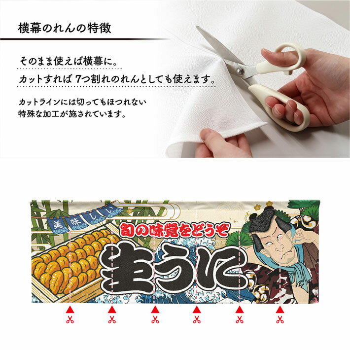 【4日20時から2時間P10倍】のれん 生うに 海鮮 140cm幅 50cm丈 Yakusha-e Style 暖簾 横長 屋台幕 7つ割れ 装飾 飲食店 目隠し 間仕切り