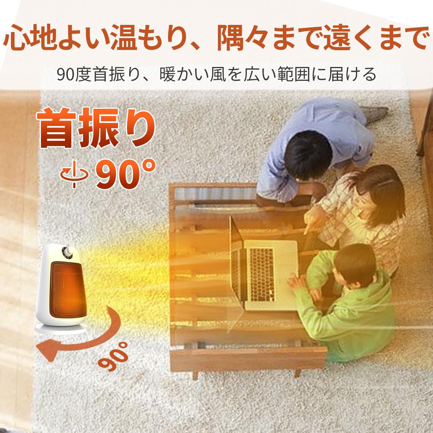 商品情報【2秒でポカポカ、パワフル速暖】このセラミックファンヒーターはスイッチを入れてわずか2秒でポカポカ暖かさを実感いただけます。寒い朝や冷えた脱衣所でも、瞬時に快適な適温空間を作り出します。小型設計で寝室やトイレ、オフィス、洗面所など様々な場所でご使用いただけます。【90度首振り、心地よい温もりを隅々まで遠くまで】このセラミックヒーターは90度首振り機能付き、広範囲に温かい風を届けます。また、風方向は上向きとなるため、一箇所に集中せず、部屋全体をムラなく暖め、快適な暖房を提供します。【3モード切替え、理想な適温空間へ】送風、低温風、高温風の3つのモードをレバー1つで簡単に切り替え可能。季節や室温、お好みに合わせて快適な風を選べる、便利なセラミックヒーターです。アナログのスイッチ操作となるものの、リモートをなくす心配がなくなります。【転倒時も、過熱時も自動で守る安全設計】転倒時には自動で電源がオフになる安全設計となります。さらに過熱保護機能付きで、温度の過度な上昇を防ぎ、安心して長時間使用できるセラミックヒーターです。セラミックヒーター 暖房器具 2秒即暖 3モード切替 90度首振り 広範囲送風 転倒OFF 過熱保護 セラミックファンヒーター 足元ヒーター 電気 小型 寝室 脱衣所 トイレ オフィス 洗面所 セラミックファンヒーター 足元ヒーター 電気 小型 寝室 脱衣所 トイレ オフィス 洗面所 5