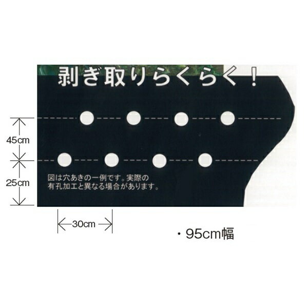 マルチ幅 95cm 穴列 2列 株間 30cm 条間 45cm 剥ぎ取りし易いミシン目入り。 機械展張にも対応しています。 とうもろこしや、ブロッコリーなどの茎が残って剥ぎ取り難い作物や、キャベツなどの下葉が茂って剥ぎ取り難い作物などに最適です。 落花生の子房柄が土にささる際にも、ミシン目を破って使用できます。 ミシン目と植え穴が重なっていない為、破れ難く機械展張も可能です。 生分解性マルチと比べ経済的です。 【日本農業システム楽天市場店について】 お客様に自信を持って、おすすめできる商品のみを取り扱い、上質で安心安全な商品をコスパよくお客さまにお届けしたいと考えております。 ランキング上位商品、人気商品、お得な訳ありアウトレット商品、最安商品、お買い得な値引き、セール商品、ポイント10倍商品等、はお問い合わせが多く、 数に限りがありますので、お早目にお買い求めください。