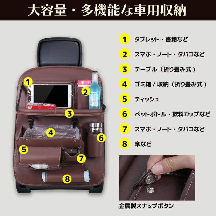 【後部座席の収納スペース】 車内で散らかりがちなアイテム等を整理整頓して収納できます。 これで家族や友人達の同乗者に、快適なドライブ空間と楽しい時間を提供できます。 車内の快適性を高め、車のグレードが向上し満足感を得られます。スタイリッシュなデザインで、 車がスッキリします! 【折り畳み式テーブルの機能】 折り畳みテーブルを付き、軽く仕事やPC作業や食事などする事ができます。また使わない時、テーブルが閉じて車内も邪魔になりません。軽自動車SUV・ミニバンなど大部の車の椅子に適用です。 【多機能】 様々な収納ポケットがあり:飲み物、タブレット、テッシュ、雨傘、赤ちゃん用品、おもちゃ、お菓子、新聞、雑誌などの車に散乱する用品をひとまとめにできて便利です、車内空間利用率をアップできる利器で、収納スペースの少ない後部座席に最適で、後部座席はスッキリになるコツです。 【120日間保証】 ご使用中においてのお客様の過失による故障、破損、改造等はサポート保証の対象外となります 【注意事項】 ●運送事故により箱が潰れる可能性がございます。 ●お問い合わせとメールを承りますので、レビューを書く前にご確認ください。質問や苦情を相談して有効に解決しましょう。 ●レビューからは当店側からお客様を特定/対応する ことができません。評価をつける前にストアに 直接ご連絡いただければすぐに対応いたします。