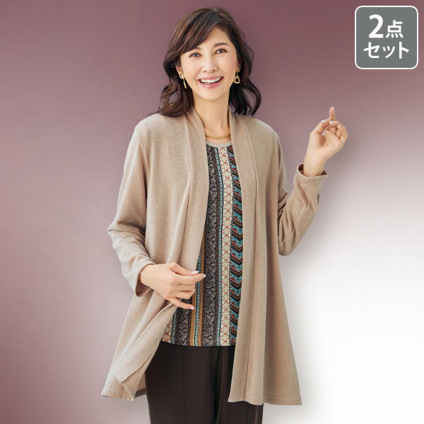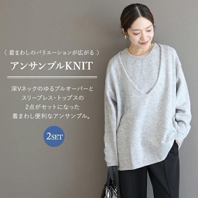 天竺編みアンサンブルレイヤードニット 【メール便不可】アンサンブル ニット プルオーバー 長袖 タンクトップ ミドルゲージ 体型カバー 伸縮 重ね着 秋 冬 30代 40代 レディース