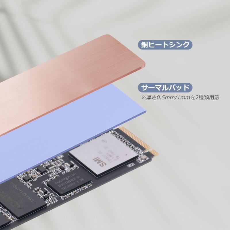 Mauknci m.2 ヒートシンク 銅 薄型 ヒートシンク デスクトップ ラップトップ 用 m.2 ssd ヒートシンク 【2セット】【2280 NVMe m.2 SSD用ヒートシンク】2280mm NVMe m.2 SSDと互換できる m.2 ヒートシンクです。2セット包装で、長くご使用頂けます。【薄型設計】あまりスペースのないラップトップ、デスクトップ向けに設計する銅 m.2 ヒートシンク。厚さ 最小1.5mmしか増加しないまで抑えることができ、より多いノートパソコンに適します。【高品質銅】100%銅材質、厚さ1mmコンパクトな銅板ですが、アルミ制よりよい放熱効果を持ちますので、高性能SSDの熱暴走としてよい対策。【簡単に取り付け】厚さ0.5mm/1mm 2種類のサーマルパッド、また固定用にシリコンバンド、耐高温テープ 2種類もあり、実際のスペースにより、ご選択できます。【パッケージ内容】M.2 SSD銅ヒートシンク*2枚、サーマルパッド(厚さ1mm/0.5mm)其々2枚、固定用シリコンバンド*6個、固定用耐高温テープ*6枚、クリーニングセット*1ペア、ドライバー*1、説明書。