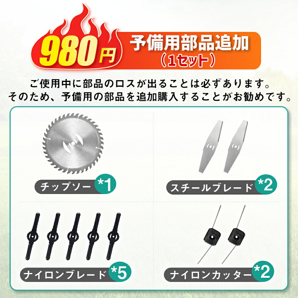 1機多役 充電式草刈機 至れり尽くせりの草刈機のセットです カラー: オレンジ 電源:バッテリー式 色:オレンジ 商品の重量:2.54 キログラム 商品の寸法:128長さ x 15幅 cm 弊社を選ぶ理由 ※園芸・DIY用途で人気の電動式草刈機。体重量わずか1.1kg、軽量で使いやすく、力の弱い女性やお年寄りでも簡単に扱えます。 ※草刈機 充電式はコードレスで近くに電源がなくても使用できるので、電源確保のストレスから解放。 ※高品質純銅モーターを採用し、出力は毎分18000rpmの大出力により、草刈り効率は一層向上することができます。 ※充電式なのに、パワーあり、ハイパワーモーターを採用して簡単に楽に本格草刈り。 ※取り付け簡単!刃の交換はたった5分で完了します!どんな年齢層の方でも簡単に取り付けできる設計となっています。 ※注意事項 (1)1個バッテリーは約25分間に使用可能(作業状況により使用時間が異なる場合があります) (2)ナイロンブレードを使用する時、石など硬いもの当たると折れやすいご注意ください。 (3)充電状況:コンセントに指した時に充電中の場合は赤色のランプ点灯、フル充電の時は緑色が点灯します。 【この商品について】 【コードレス 充電式 草刈り機】 充電式草刈機はエンジン式のように燃料を補給する必要が無く、安全に使用することができる便利な草刈機です。充電式でコードレスだから、どこでも持ち運べて便利コードが絡まったり、うっかり切断することもないので安心。コードレスでも切れ味抜群!高速回転するブレードで伸びきった太い草や小枝が効率にカットでき、ラクラクな体験が実現! 【角度や長さを調節できる】 約90〜128CM伸縮可能なので、自分の身長に合わせてお使い頂けます。小さくすれば車での持ち運びも便利、倉庫への収納にも邪魔になりません。ヘッド部分の角度ボタンを押すと、角度を3段階に調節できます。地面や垣根など、用途に合わせて変えられるので作業がはかどります。 【安全面を考慮した設計】 安心してお使いいただくために、様々な安全保護対策を施しています。ダブルロックで誤操作防止、不意の誤操作を防ぎます。また保護カバー付きで小石やゴミの飛び散りを防いでくれます。 【軽量&女性でも快適に使える】 モーター駆動のため、振動が少なくて軽くて取り回しやすく、振動による疲労を軽減することができます。作業音も小さめなのが特徴です。 【商品内容】 本体、バッテリー×1、電源アダプター、チップソー×1+スチールブレード×2+ナイロンブレード×5、レンチ×2、ナイロンカッター×2、保護めがね、手袋;製品はブランド品質で1年間保証があります、保証期間に商品何か問題が発生した場合は、弊社までお気軽にお問い合わせください、問題を解決できるよう最善を尽くします。 メーカー希望小売価格はメーカーサイトに基づいて掲載しています