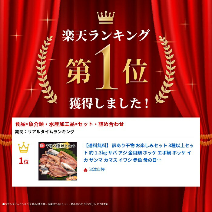 商品情報内容量サバ(ノルウェー産)、あじ(長崎県・オランダ産)、金目鯛(宮城県産)、縞ホッケ(アメリカ・ロシア産)、エボ鯛(中国・国産)、真ほっけ(北海道産)、イカ(青森県産)、サンマ(北海道産)、カマス(宮崎県産)、イワシ(千葉県産)、赤魚(アメリカ産)、ニシン(北海道・オランダ産)のいずれか3種類以上 合計約1.3kg原材料国産・ノルウェー産・オランダ産・アメリカ産・ロシア産賞味期限発送日から保存で30日、解凍後冷蔵保存で5日アレルギー小麦、ごま、さけ、大豆商品の特徴干物の里 沼津市の沼津海産物協同組合がお届けする、訳あり干物セット。サバ、あじ、金目鯛、縞ホッケ、エボ鯛、真ほっけ、イカ、サンマ、カマス、イワシ、赤魚、ニシン、レンジでチンできる干物など……いずれか3種類以上 合計約1.3kgをお届けします。サイズのバラつきや多少のキズ、頭の部分が無いものが混在している訳あり品ですが、品質にこだわって生産された干物なので、味には一切問題なし、美味しく頂けます。何が入っているかはお楽しみ。季節ごとの魚種の変化もお楽しみ頂けます。【注意事項】※訳ありの都合上、魚種の指定はできず、同じ魚種が複数入る場合がありますので、ご了承ください。※訳ありセットのため、お届けまで2週間程度お時間がかかる場合がございます。配送業者ヤマト運輸配送温度帯冷凍販売事業者沼津海産物協同組合 季節の節目に お正月 新年 新春 成人式 成人 節分 バレンタイン ひな祭り ホワイトデー 卒業式 卒業 入学式 入学 お花見 ゴールデンウィーク GW こどもの日 端午の節句 七夕初盆 お盆 お中元 中元 お彼岸 残暑見舞い お月見 敬老の日 お母さん ママ 母 母親 お父さん パパ 父 父親 おじいちゃん 祖父 おばあちゃん 祖母 ハロウィン ハロウィーン 寒中見舞い クリスマス お歳暮 おおみそか 大晦日 ギフト プレゼント 贈り物 感謝やお祝いの気持ちに お見舞い 退院 全快 快気 ごあいさつ ご挨拶 挨拶 引っ越し お宮参り 合格 進学 成人式 幼稚園 入園 入学 小学校 中学校 高校 大学 卒業記念品 記念品 卒業 就職 社会人 お祝い 内祝い 金婚式 銀婚式 結婚 結婚式 引き出物 引出物 引き菓子 出産 新築 誕生日 お誕生日 記念日 バースデー バースデイ バースディ 七五三 節句 昇進 昇格 就任 出世 祝 祝い お祝い お供え お供え物 法事 団体や法人様向けに 開店 送迎 コンペ 手土産 転勤 退職 寸志 歓迎 記念品 異動 開業 定年退職 歓送迎会 異動 贈答品 土産 景品 挨拶回り 転職 歓迎 送別 記念 忘年会 新歓 新年会 周年 景品 餞別 定年退職 二次会 粗品 栄転 景品 こんなタイミングでも おもてなし おすそ分け キャンプ グランピング BBQ おうち時間 バーベキュー アウトドア 母の日 父の日 パーティー 初盆 イベント 贈答 お裾分け ホームパーティ 丑の日 土曜の丑の日 土用の丑の日 夏の丑の日 冬の丑の日こちらもオススメです!干物の名産地の老舗「すずひで」がセレクトすずひでの訳あり干物 おまかせ 2kg 詰め合わせセット [金額]3,080円約4kgと大ボリュームの訳あり干物セットすずひでの訳あり干物 おまかせ 4kg 詰め合わせセット [金額]5,300円高級魚金目鯛の干物セット金目鯛の干物 9枚セット(ハイパック包装)[金額]5,120円特許取得の製法で作られた「砂干しのサバ」無添加 無着色 川正さんの砂干しのサバ 4枚セット[金額]3,280円