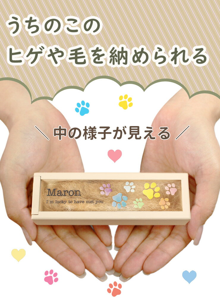 遺毛ケース1点 名入れなし:2,480円(税込) 名入れあり:2,980円(税込) 外寸(約):高さ2cm×横幅13cm×奥行約4cm 内寸(約):深さ1.5cm×横幅12cm×奥行2.8cm 表記サイズと数ミリの誤差が生じる場合がございます。 MDF(塗装)/アクリル板/磁石 【名入れあり】を選択の場合 こちらの商品は原稿確認を行っておりませんので、入力内容は必ずご確認の上ご注文の確定を行って下さい。 レイアウト基準を設けておりますがご注文内容によっては細かなバランス調整等をいたします。 ・過去のご注文時と揃えたい場合はお手数ですが事前に過去の購入履歴とともにご連絡くださいませ。 出来る限りの対応をいたします。 ご不明点はご依頼前にお問合せください。 にゃんばーわん工房 Mail:nyan-wan-kobo@shop.rakuten.co.jpうちのコのヒゲや毛を大切に納めておけるケースです。 前面はアクリル製で割れたりすることがなく安心です。 透明で中が見えるので納めた毛やヒゲを いつでも眺めることができます。 お名前やメッセージ、年月日などを入れることもできます。 (※印刷希望の場合は注文の際に必要事項を入力してください。 原稿確認はございませんのでご注意ください。) お届け内容 遺毛ケース1点 名入れなし:2,480円(税込) 名入れあり:2,980円(税込) サイズ・材質 外寸(約):高さ2cm×横幅13cm×奥行約4cm 内寸(約):深さ1.5cm×横幅12cm×奥行2.8cm 表記サイズと数ミリの誤差が生じる場合がございます。 MDF(塗装)/アクリル板/磁石 注意事項 【名入れあり】を選択の場合 こちらの商品は原稿確認を行っておりませんので、入力内容は必ずご確認の上ご注文の確定を行って下さい。 レイアウト基準を設けておりますがご注文内容によっては細かなバランス調整等をいたします。 ・過去のご注文時と揃えたい場合はお手数ですが事前に過去の購入履歴とともにご連絡くださいませ。 出来る限りの対応をいたします。 ご不明点はご依頼前にお問合せください。 にゃんばーわん工房 Mail:nyan-wan-kobo@shop.rakuten.co.jp