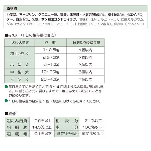 お店TOP>犬用品>犬のおやつ・サプリメント>ビスケット・クッキー・パン ・ボーロ>犬のクッキー・ビスケット>ビスカル シニア (900g)【ビスカル シニアの商品詳細】●目の健康の為にマリーゴールド抽出物のルテイン、関節の健康のためにグルコサミンを配合した7歳からの健康応援ビスケット【ビスカル シニアの原材料】小麦粉、マーガリン、グラニュー糖、鶏卵、米胚芽・大豆発酵抽出物、樹木抽出物、ホエイパウダー、脱脂粉乳、乳糖、サメ抽出コンドロイチン、甘味料(D-ソルビトール)、炭酸カルシウム、グルコサミン(カニ・エビ由来)、マリーゴールド抽出物(ルテイン含有)、保存料(ビタミンE)【栄養成分】粗たんぱく質:7.6%以上粗脂肪:14.5%以上粗繊維:0.1%以下粗灰分:2.1%以下水分:10%以下【ブランド】ビスカル【発売元、製造元、輸入元又は販売元】現代製薬リニューアルに伴い、パッケージ・内容等予告なく変更する場合がございます。予めご了承ください。(BISCAL)現代製薬190-1222 東京都西多摩郡瑞穂町箱根ケ崎東松原8-4042-556-2528広告文責:楽天グループ株式会社電話:050-5306-1825[犬用品/ブランド:ビスカル/]