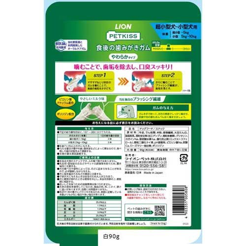 お店TOP>犬用品>犬のおやつ・サプリメント>犬のデンタルケアおやつ>その他>ペットキッス 食後の歯みがきガム やわらかタイプ 超小型犬〜小型犬用 (90g)【ペットキッス 食後の歯みがきガム やわらかタイプ 超小型犬〜小型犬用の商品詳細】●メーカー獣医師と共同開発した歯みがきガム。●ブラッシング繊維のガムをギザギザねじり形状に。ギザギザねじり形状のガムを噛むことで、歯面の歯垢をかき出す。さらに噛むことで、歯垢を落として口臭を抑制。●ミルク風味●ピロリン酸ナトリウム、ポリリジン配合。●かためのガムが苦手なワンちゃんにおすすめ【使用方法】下記の給与量を目安に、1日1〜2回に分けてお与えください。犬の大きさ(体重):超小型犬(〜5kg)、小型犬(5kg〜10kg)1日の給与量の目安:2本・生後7カ月以上の愛犬に与えてください。・与える量は犬種、体脂肪量、年齢、運動量、環境温度、ストレス、個体差などによって異なりますので、食べ残しや便の状態をみて調節してください。・主食の量は適宜調節してください。【ペットキッス 食後の歯みがきガム やわらかタイプ 超小型犬〜小型犬用の原材料】牛皮、でん粉類、米粉、食物繊維、大豆たん白、脱脂粉乳、増粘安定剤(加工デンプン、増粘多糖類)、グリセリン、カゼインNa、亜硫酸水素ナトリウム、酸化防止剤(ミックストコフェロール)、微粒二酸化ケイ素、pH調整剤、ピロリン酸Na、炭酸Ca、ローズマリー抽出物、ポリリジン【栄養成分】たんぱく質:25.0%以上、脂質:1.5%以上、粗繊維:1.0%以下、灰分:3.0%以下、水分:25.0%以下、エネルギー:1本あたり約8.6kcal【保存方法】・お買い上げ後は、直射日光の当たらない、湿気の少ないところで保存してください。・開封後はチャックをしっかり閉じて冷蔵庫で保存し、なるべく早めにお与えください。【注意事項】・本品は愛犬用のスナックです。人の食べ物ではありません。・子供が愛犬に与えるときは安全のため大人が立ち会ってください。・天然の牛皮を使用しているため、色・形・ニオイ・硬さに若干の違いがありますが、品質には問題ありません。・乳幼児や認知症の方などの誤食を防ぐため、置き場所に注意してください。・愛犬の食べ方や習性によっては、のどに詰まらせることがありますので、必ず観察しながらお与えください。・おいしさを保つための脱酸素剤は食べられません。・本品は天然物を使用しているため形状や重さにバラツキがあります。そのため表面に記載している「35本」よりも少ない場合や多い場合があります。【ブランド】ペットキッス【発売元、製造元、輸入元又は販売元】ライオンペット株式会社リニューアルに伴い、パッケージ・内容等予告なく変更する場合がございます。予めご了承ください。ライオンペット株式会社111-8644 東京都台東区蔵前1-3-28(ライオン株式会社 お客様センター)0120-556-581広告文責:楽天グループ株式会社電話:050-5306-1825[犬用品/ブランド:ペットキッス/]