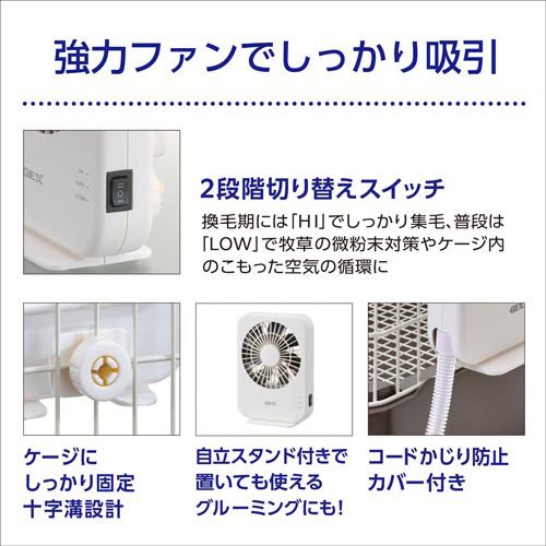 お店TOP>小動物・鳥・は虫類・昆虫>小動物雑貨・ケアグッズ>エアグルームDC (1個)【エアグルームDCの商品詳細】●強力ファンで抜け毛や牧草をしっかり吸引!●ケージに取り付けるだけでケージ内に舞い散る抜け毛や牧草の微粉末をキャッチ!●毛球症の原因にもなる換毛期の抜け毛や、牧草の微粉末を強力なファンでしっかり吸引!専用フィルターを使用して微細な毛や粉塵をキャッチし、ケージ内の空気の循環にも役立ちます。●フィルターは不織布層で抜け毛をしっかりキャッチ!●脱臭活性炭入りなので臭いを軽減!●2段階切り替えスイッチ・換毛期には「HI(強)」でしっかり集毛、普段は「LOW(弱)」で牧草の微粉末対策やケージ内のこもった空気の順かに。・選択できる2段階切り替えスイッチ採用。●お手入れは専用フィルターを交換するだけ。ケージのお掃除の手間を軽減します。●うさぎ飼育に適した設計・十字溝設計でケージにしっかり固定!立てた状態でも使用できる自立スタンド付きなので、グルーミング時にもご利用いただけます。・コードにはかじり防止カバーが付いているので、ペットが噛んで事故を起こすリスクを軽減。●DCモーター採用●取り付け可能ケージワイヤーの間隔:10mm以上、ワイヤー径:4mm以下●ご使用方法:ケージに取り付けるか、ケージの近くに置いてご使用ください。●本体サイズ:約幅14.5×奥行6.6×高さ19.3cm●交換用フィルター:「ラビんぐ エアグルーム交換フィルター」【使用方法】・ケージに取り付けるか、ケージの近くに置いてご使用ください。ご使用前に取扱説明書をよくお読みください。・取り付け可能ケージ:ワイヤーの間隔10mm以上、ワイヤー径4mm以下・フィルターに汚れがたまると吸引力が低下します。換毛期などはフィルターに付着した抜け毛やゴミを、ティッシュペーパーなどでつまんで定期的に取り除いてください。性能維持のため、フィルターは3週間から1ヶ月をめどに、または汚れが気になったときに交換してください。・交換用のフィルターは、「エアグルーム交換フィルター」(別売)をご使用ください。【エアグルームDCの原材料】本体:ABS フィルター:PP、PE、活性炭、ポリエステル【注意事項】・ファンに強い力や衝撃を与えないでください。故障の原因になります。・ペットに直接風が当たらないように注意してください。・ペットや用品(器具)に触れた後は、石鹸でよく手を洗ってください。【発売元、製造元、輸入元又は販売元】GEX(ジェックス)リニューアルに伴い、パッケージ・内容等予告なく変更する場合がございます。予めご了承ください。GEX(ジェックス)大阪府東大阪市今米1-14-5072-966-0054広告文責:楽天グループ株式会社電話:050-5306-1825[小動物・鳥・は虫類・昆虫]