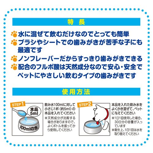 お店TOP>ペットのサークル・雑貨など>ペットの雑貨・ケアグッズ>ペットのデンタルケア>ペットの歯ブラシ>毎日キレイ らくらく飲む歯みがきウォッシュ (150ml×6セット)【毎日キレイ らくらく飲む歯みがきウォッシュの商品詳細】●水に混ぜて飲むだけなのでとっても簡単●ブラシやシートでの歯みがきが苦手な子にも適しています●ノンフレーバーだからすっきり歯みがきができる●配合のフルボ酸は天然成分。ペットにやさしい飲むタイプの歯みがきです。【使用方法】・飲み水100mlに対して小さじ1杯(約5ml)の本品を入れてください。・本品を入れた飲み水をよくかき混ぜてペットに与えてください。・衛生上1日一回は水を取り替えてください。・1日1回使用した場合、約30日分の容量が入っています。【成分】フルボ酸エキス、水、クエン酸、安息香酸ナトリウム【注意事項】・本品を犬猫の歯みがき以外の用途・目的には使用しないでください。・アレルギーや口内に傷などがある場合は使用しないでください。・使用後、口内に異常が見られた場合はすぐに使用をやめ、獣医師にご相談ください。・ボトルから直接本品を犬猫に与えないでください。・人やペットの目に入らないようにしてください。・沈殿物がみられる場合がありますが成分が固まったものですので品質には影響ありません。・開封後は冷蔵庫で保管し、早めに使いきってください。【ブランド】毎日キレイ らくらくケアシリーズ【発売元、製造元、輸入元又は販売元】スーパーキャット※説明文は単品の内容です。リニューアルに伴い、パッケージ・内容等予告なく変更する場合がございます。予めご了承ください。・単品JAN:4973640414833スーパーキャット105-0012 東京都港区芝大門2-8-13 サクセス芝大門03-3434-1122広告文責:楽天グループ株式会社電話:050-5306-1825[ペットのサークル・雑貨など/ブランド:毎日キレイ らくらくケアシリーズ/]