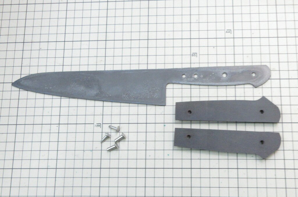 とある刃物工場からの放出品で、18センチ牛刀の材料です。すでに熱処理されているので、研削してベベルを成形して研ぎ上げると刃物として使えるようになります。ただし大変硬いので、ある程度の工作経験と機械工具が必要な上級者向きのキットです。全長:30cm、刃の長さ:18cm (1.8mm厚)、材質: SK-5 炭素鋼。パッカーウッド製のハンドル材とリベットが付属するので、それを活用すれば包丁になりますが、マイカルタ、G10、リバティウッドなど使ってオリジナリティを高めるのも良さそうです。工夫を重ねて自分だけの一本を完成させるような楽しみ方もお勧めします。